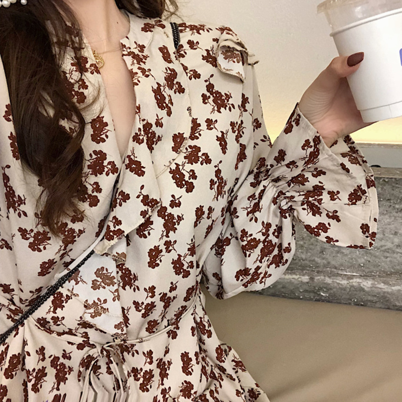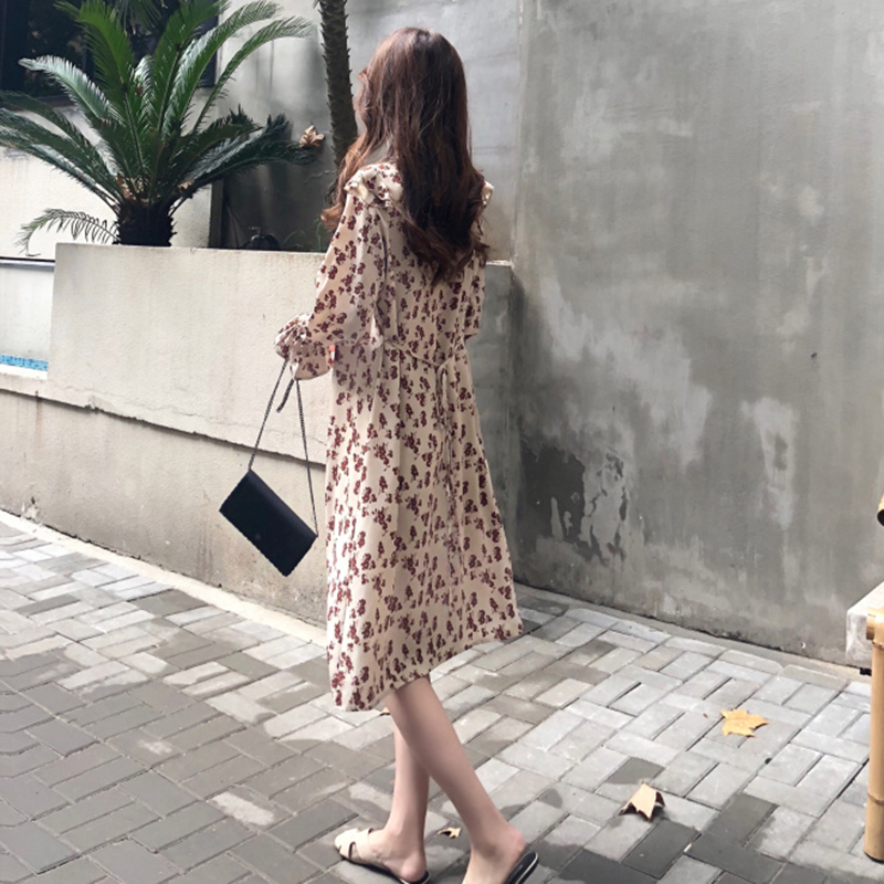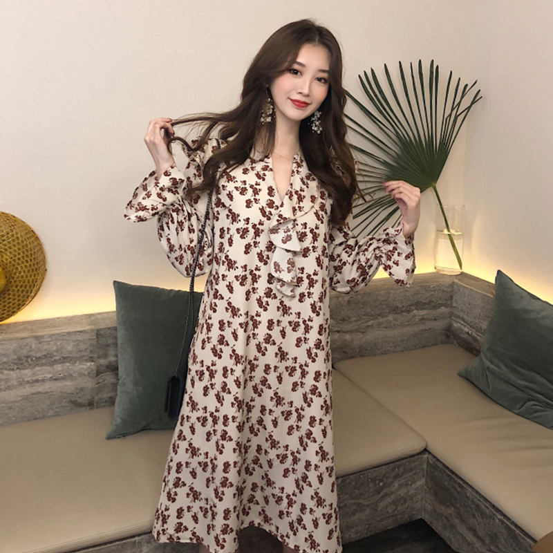秋冬女裝2018新款系帶收腰顯瘦碎花A字中長裙法式egg長袖連衣裙子