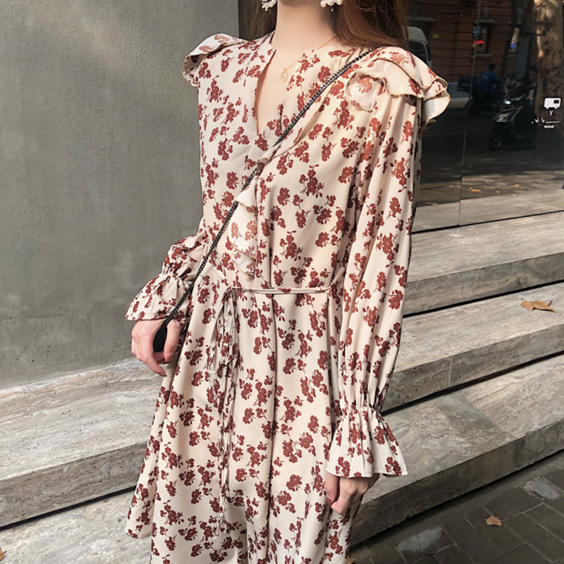 / 秋冬女裝2018新款系帶收腰顯瘦碎花A字中長裙法式egg長袖連衣裙子