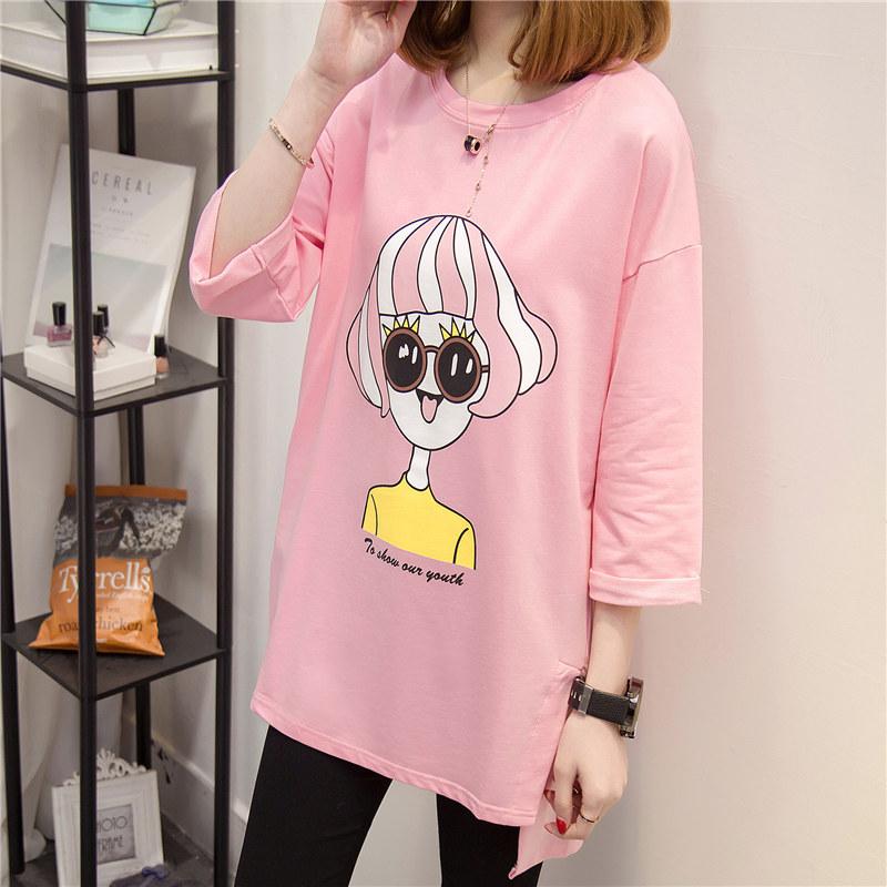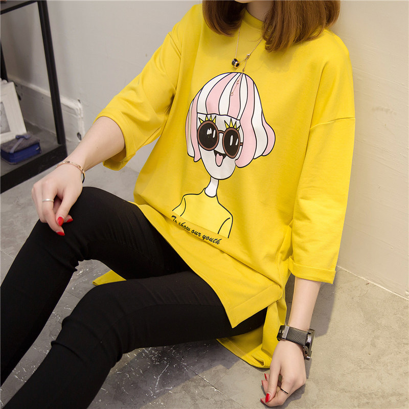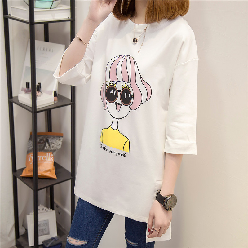 中長款短袖t恤女夏寬松韓版新款學生印花體恤女bf五分袖上衣