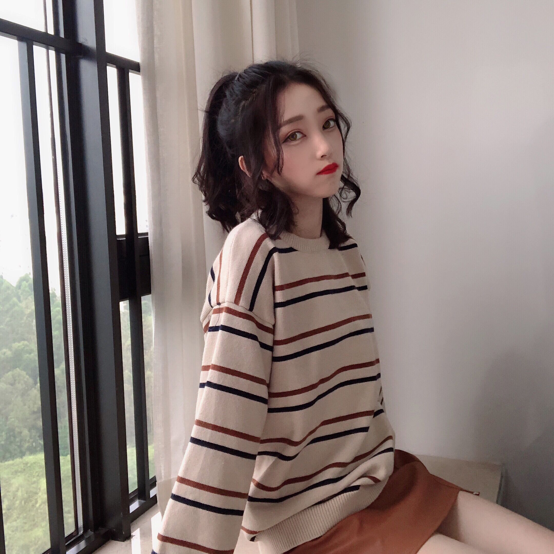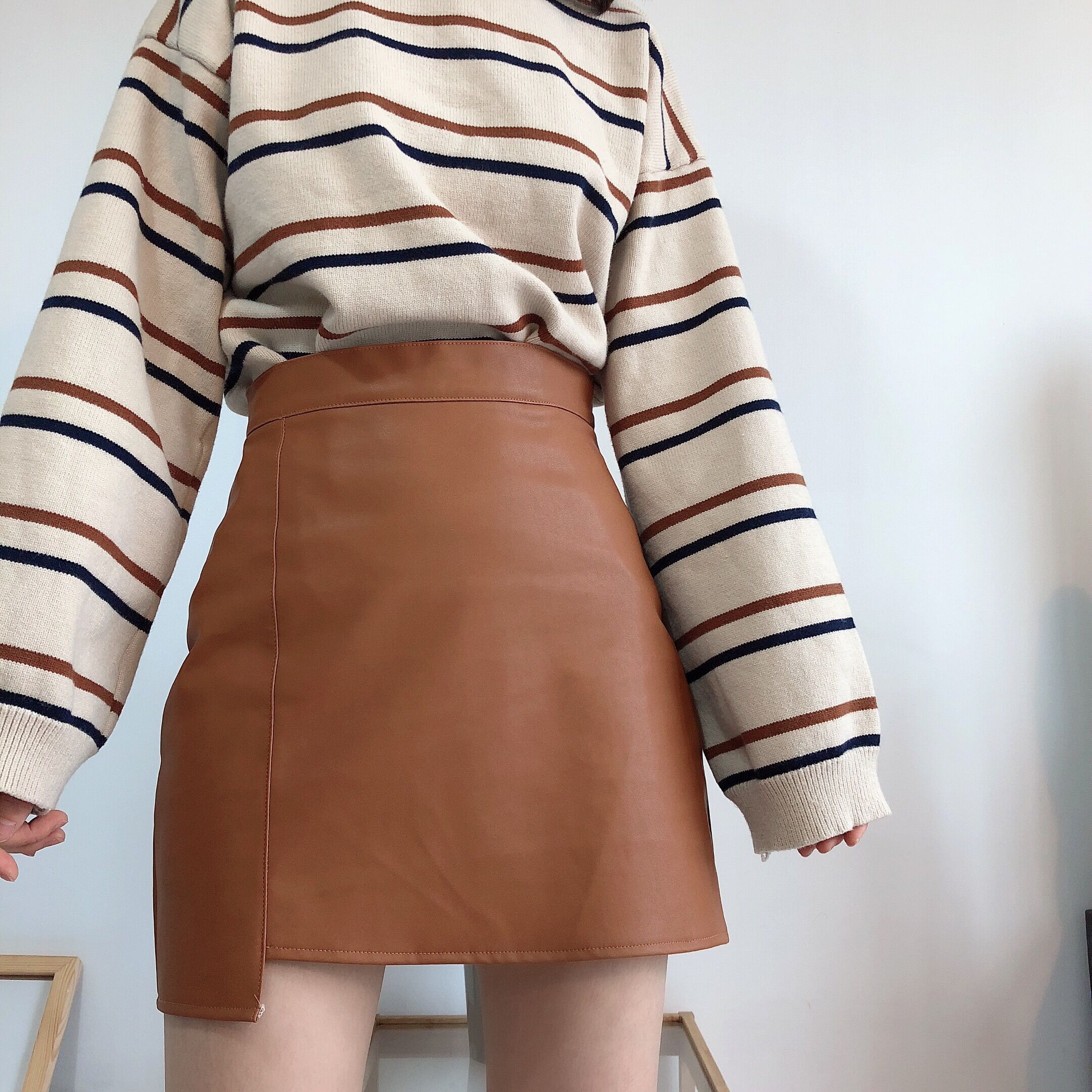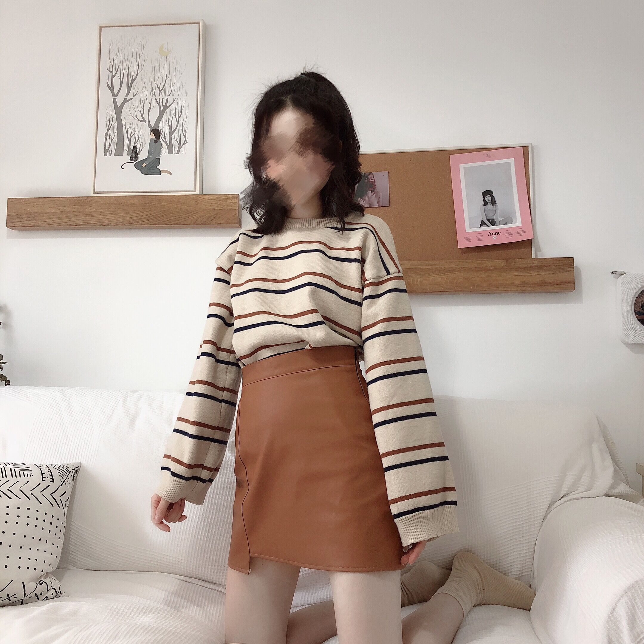 / 韓版時尚休閑套裝秋季條紋加厚針織毛衣+A字半身裙皮短裙兩件套女