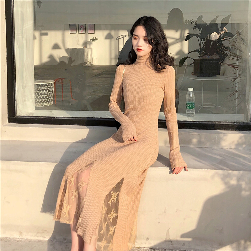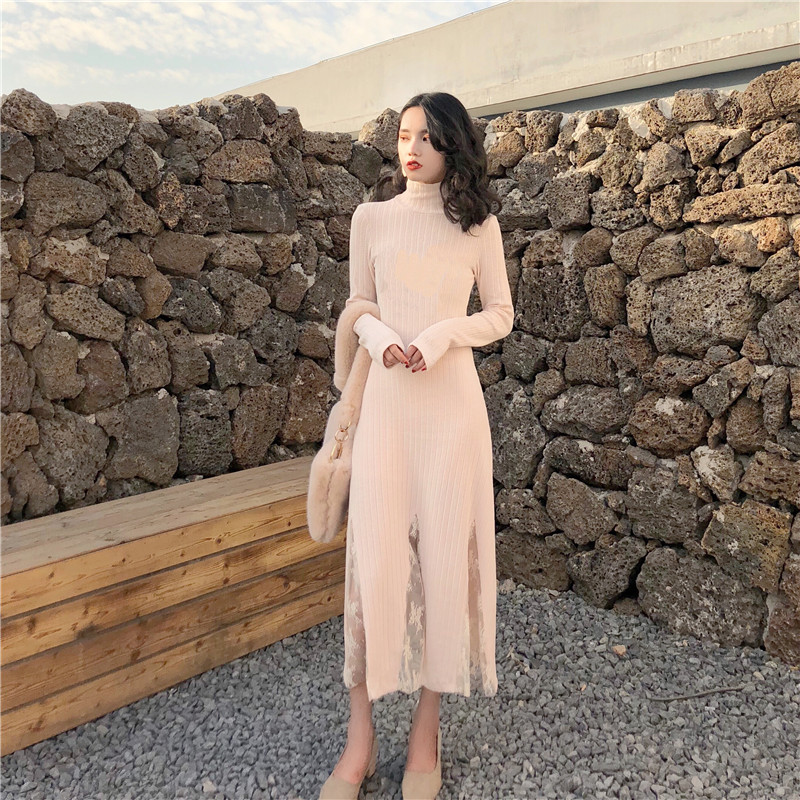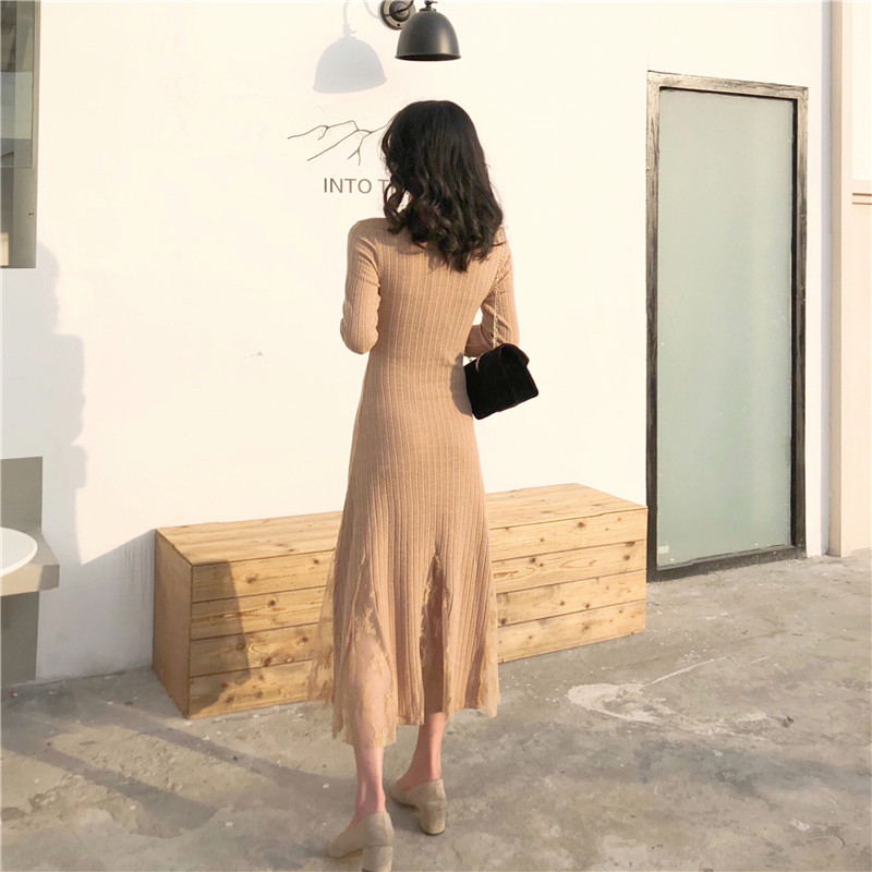 / 港味復古晚晚風森女系修身顯瘦溫柔蕾絲拼接高領純色百搭連衣裙潮