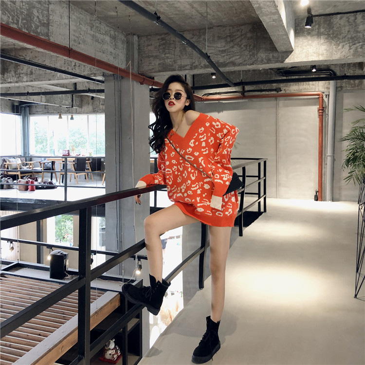 港風新品復古針織衫慵懶風V領寬松顯瘦oversize中長款毛衣上衣女