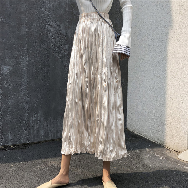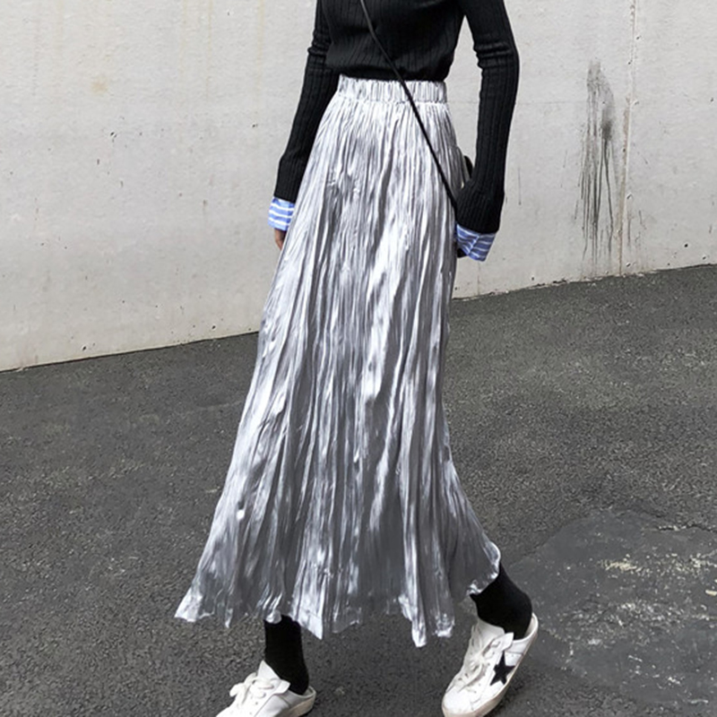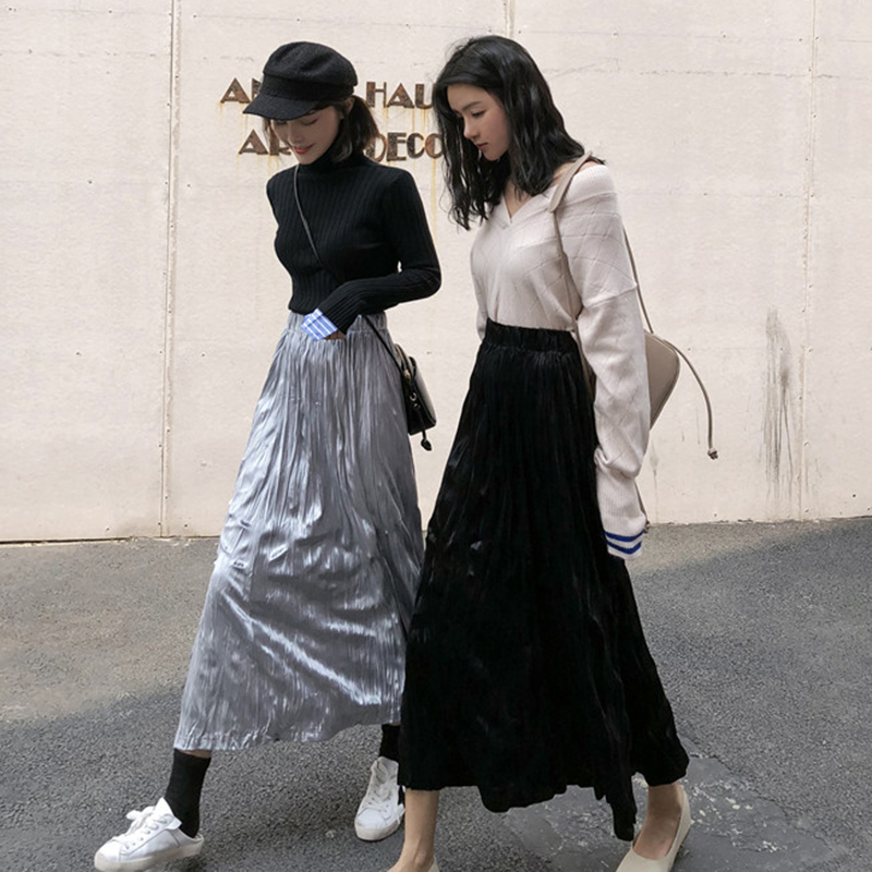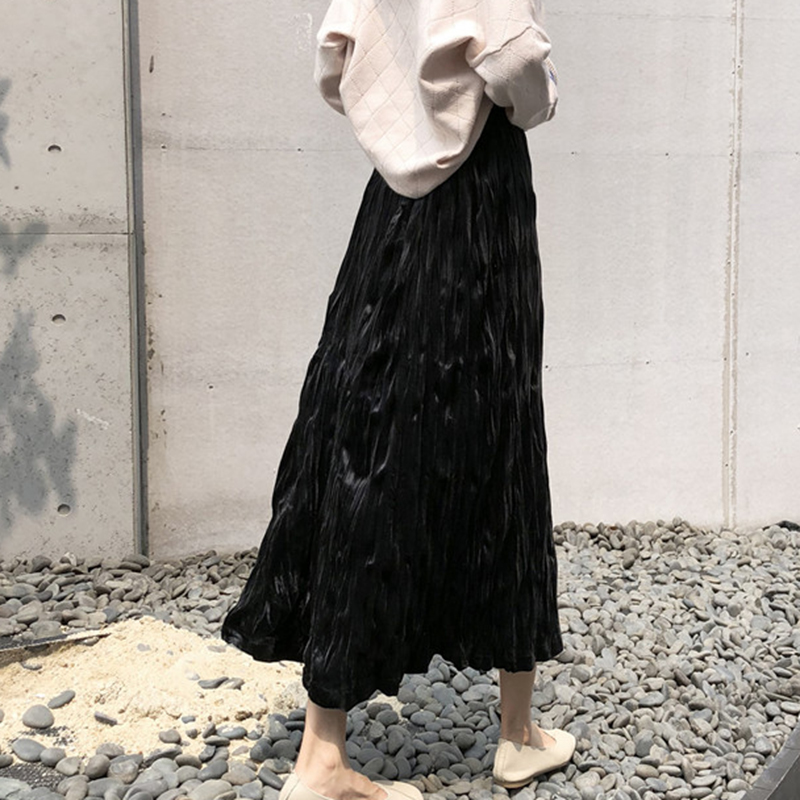 / 氣質金絲絨半身裙秋裝女2018新款時尚高腰褶皺長裙女神A字裙子潮