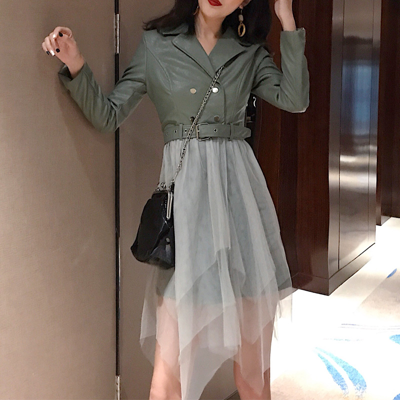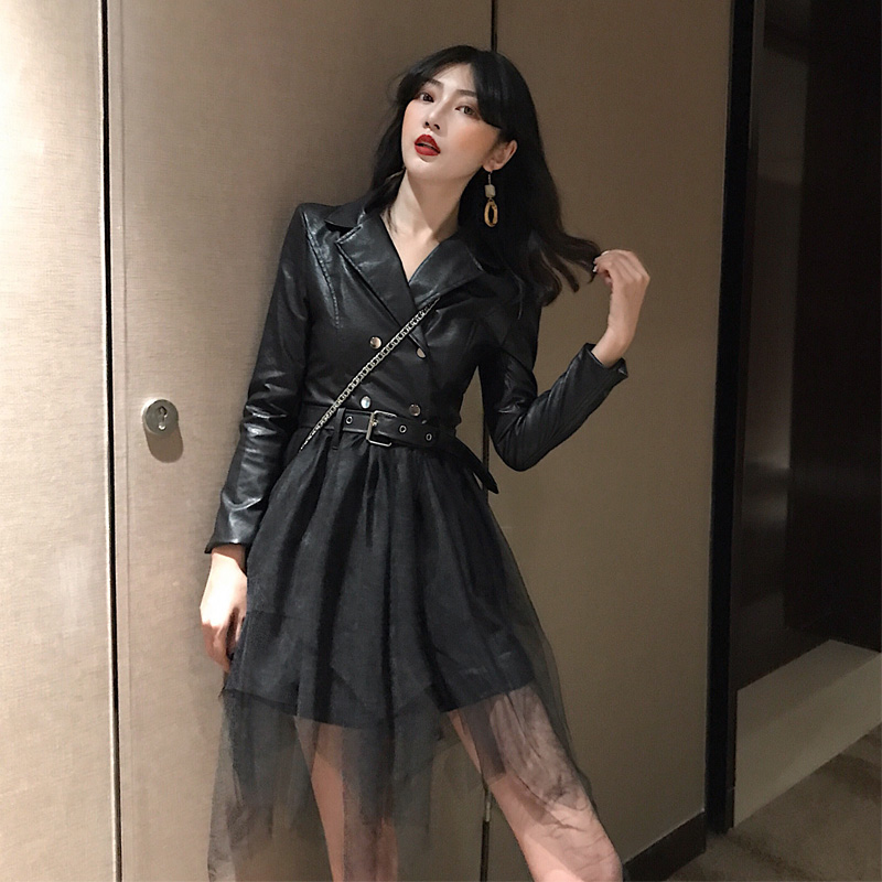 / 2018新款時尚港味氣質女人味外套皮衣拼接網紗假兩件連衣裙秋裝女