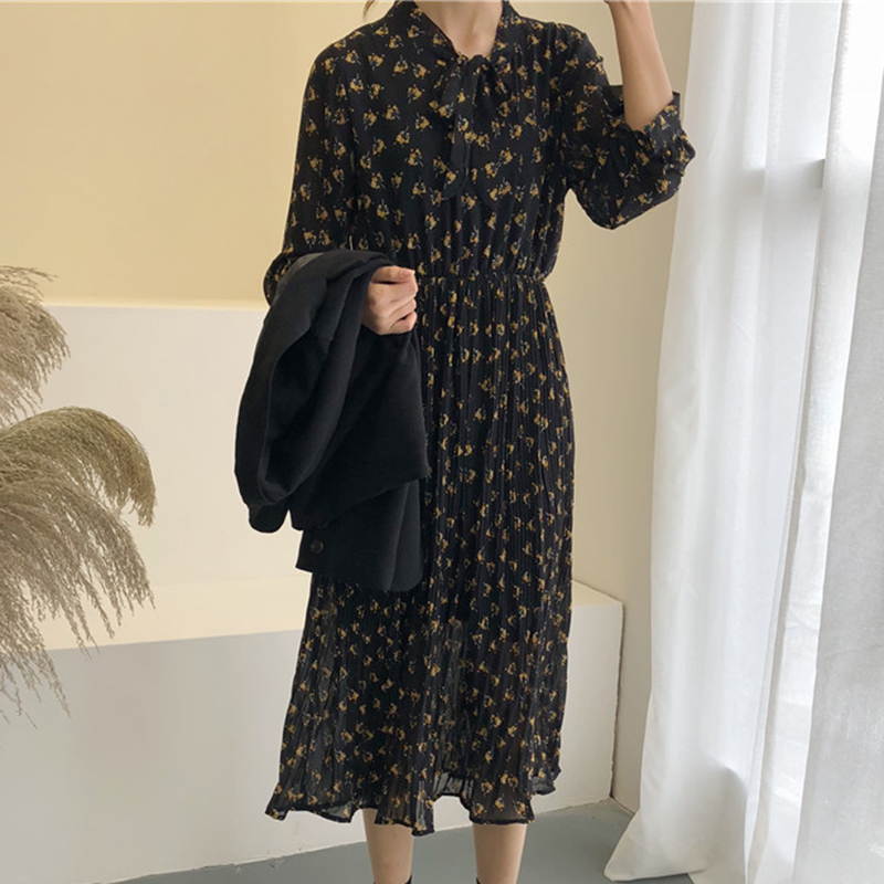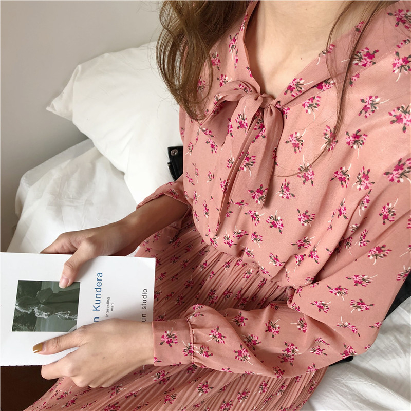 / 秋裝女2018新款法式少女茶歇裙百褶碎花雪紡連衣裙長裙女秋冬學生
