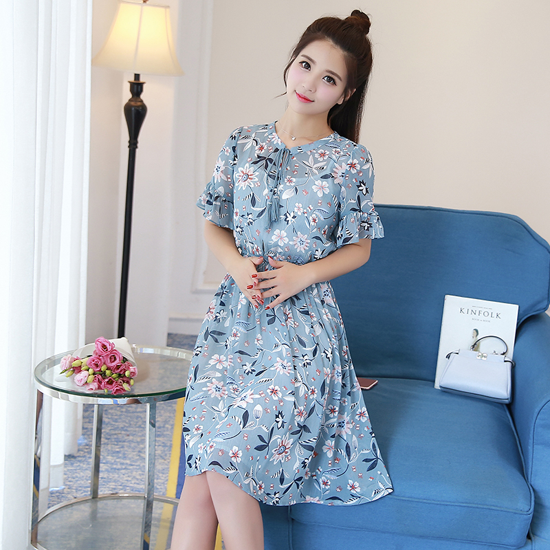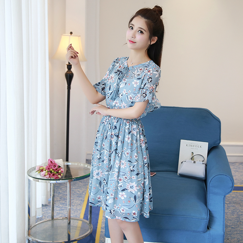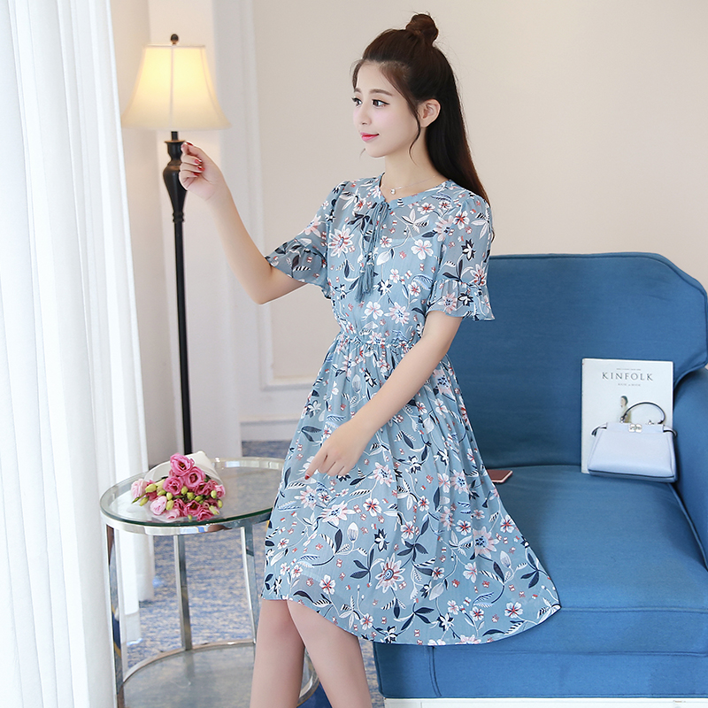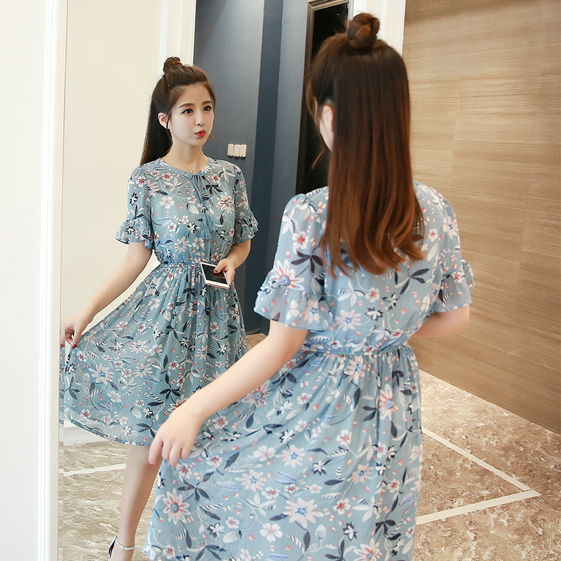/ 碎花雪紡連衣裙夏新款系帶收腰短袖印花A字裙中長款沙灘裙女