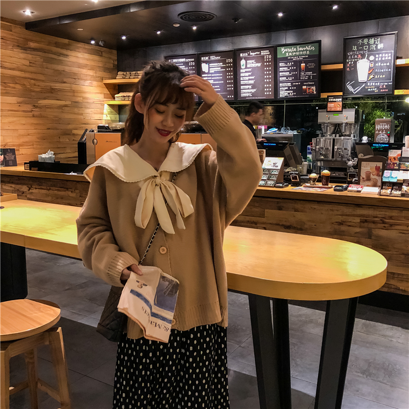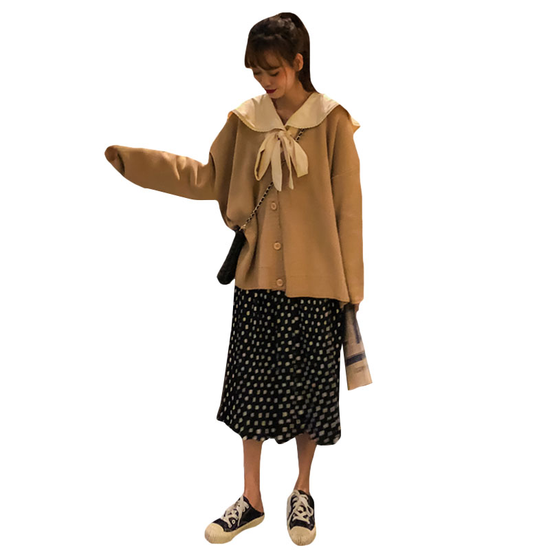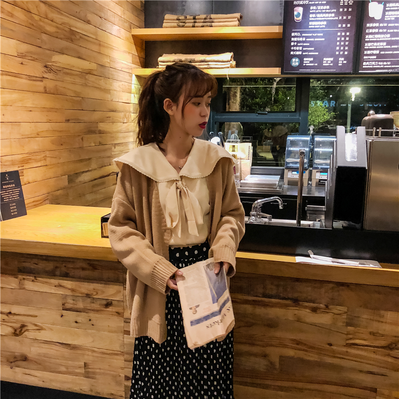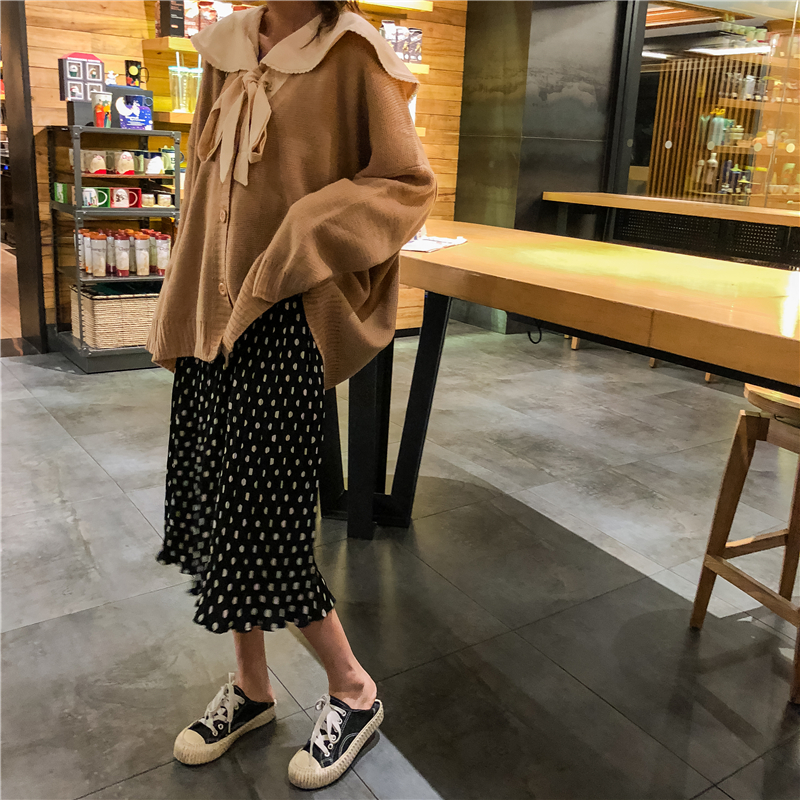 / 韓版時尚休閑套裝秋季針織開衫外套+純色襯衣+波點半身裙三件套女