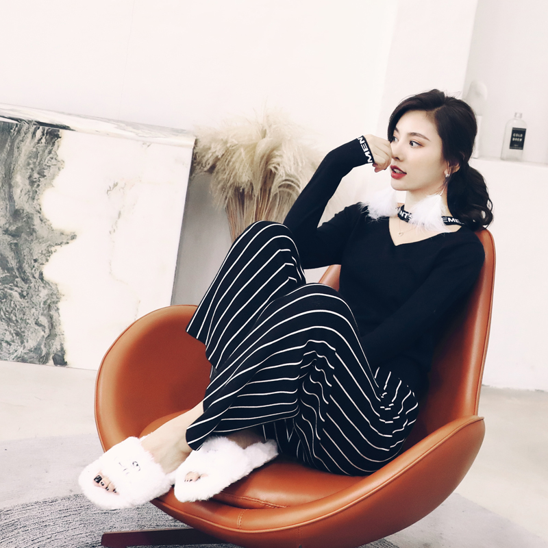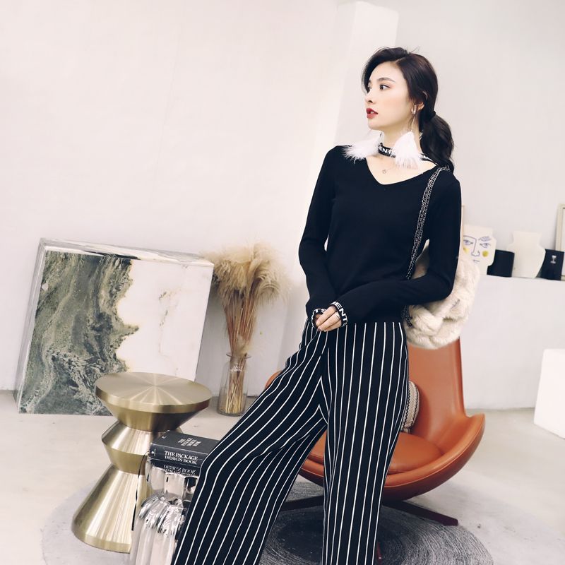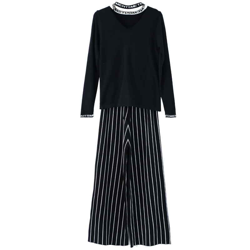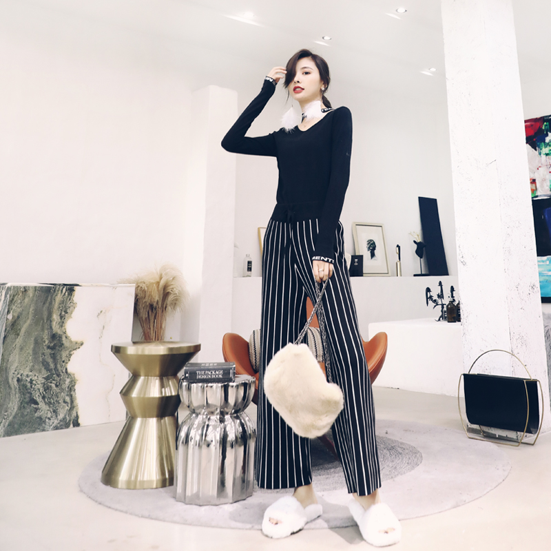 名媛氣質秋季女裝2018新款針織上衣長褲闊腿褲條紋褲子時尚兩件套