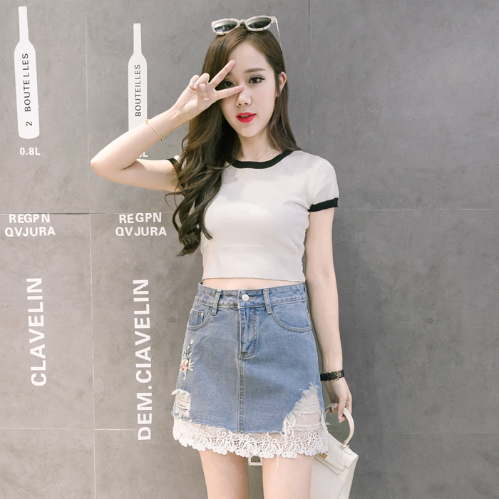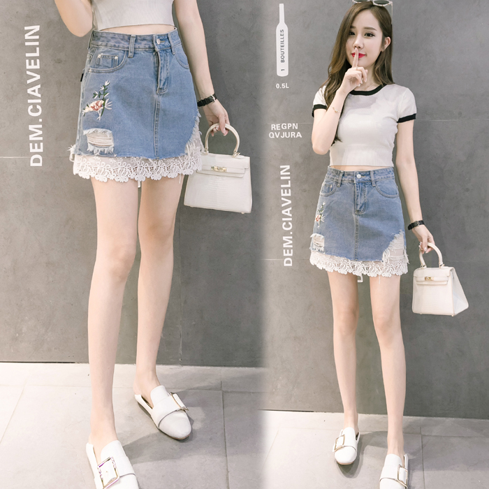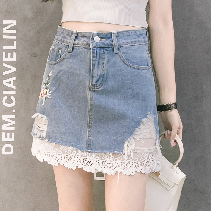 / 韓高腰破洞牛仔裙半身裙女刺繡A字裙包臀短裙繡花蕾絲拼接半裙夏