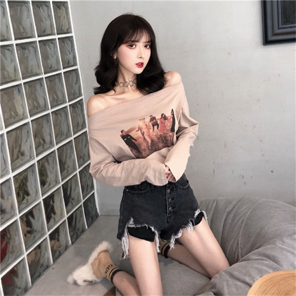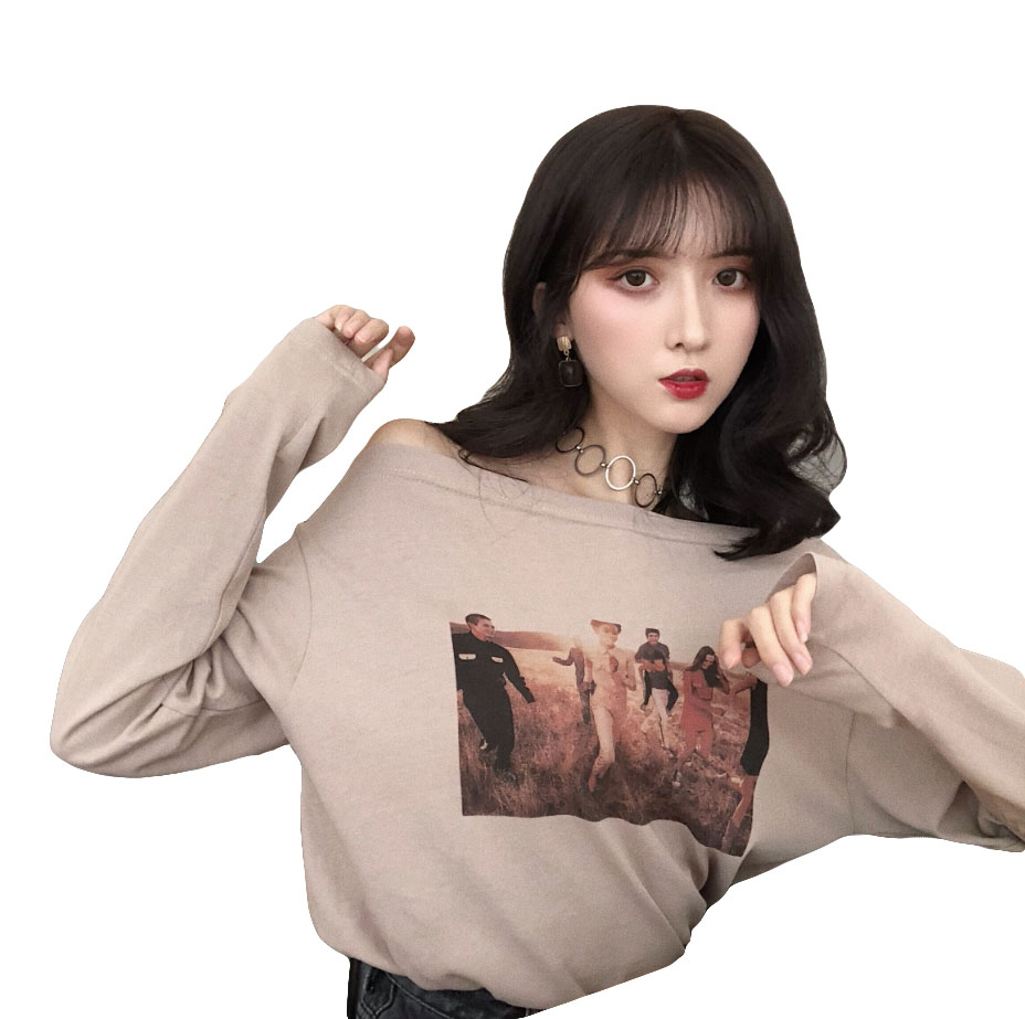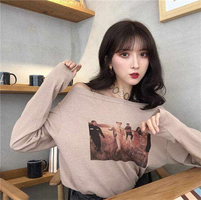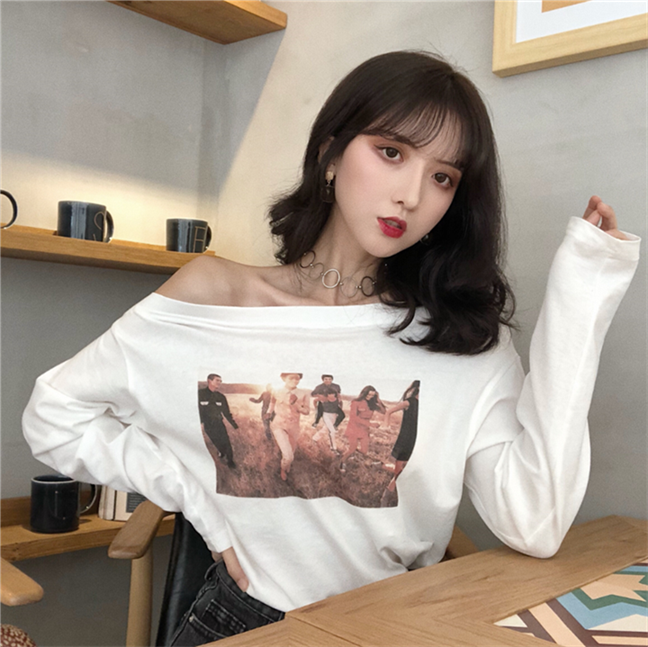 / 秋裝女2018新款時尚韓版氣質百搭印花一字肩打底長袖T恤顯瘦上衣