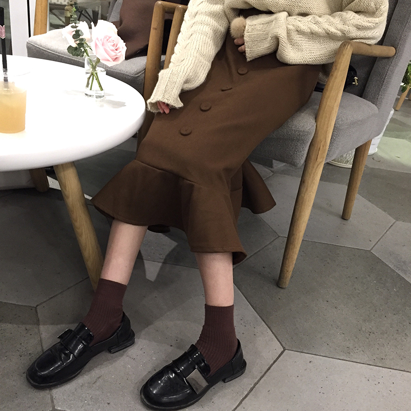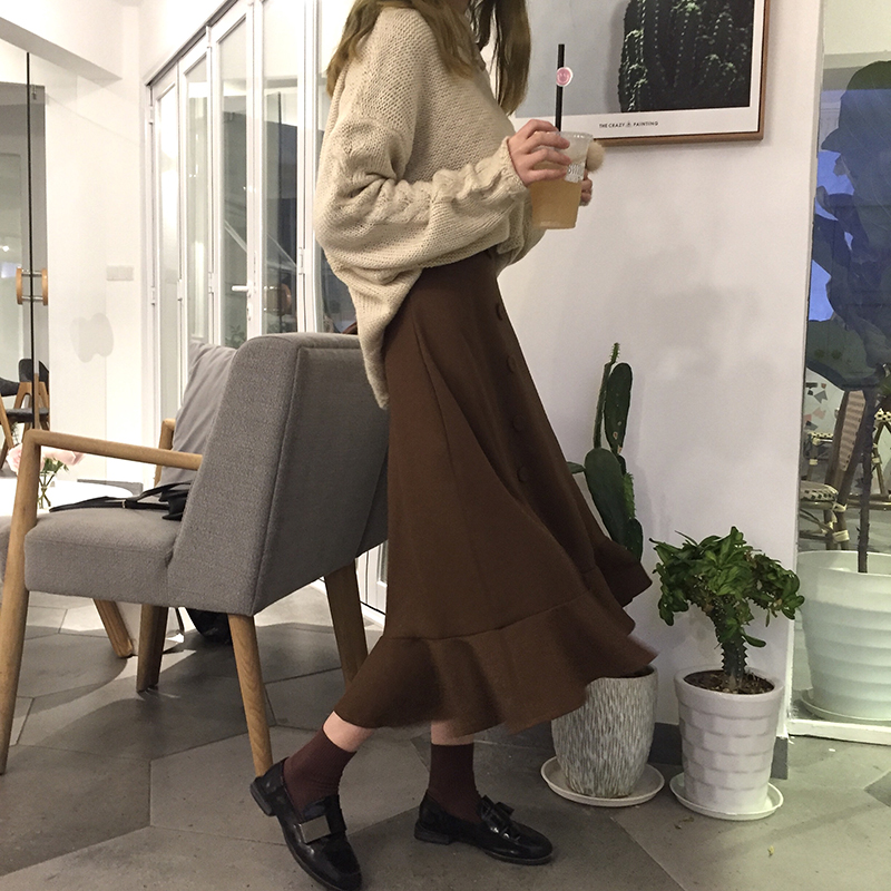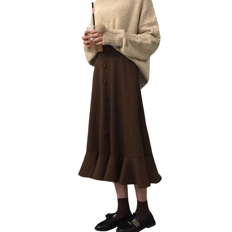 2018新款秋冬韓版簡約中長款裝飾扣A字裙荷葉邊半身裙學生裙子女