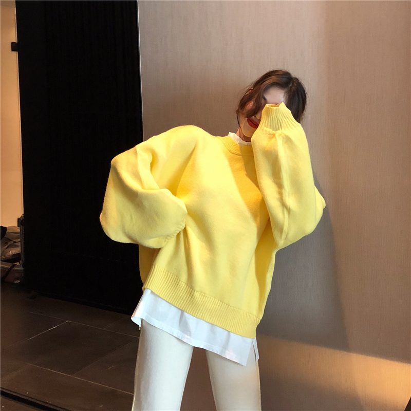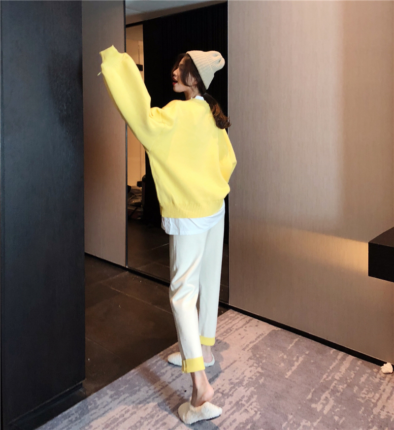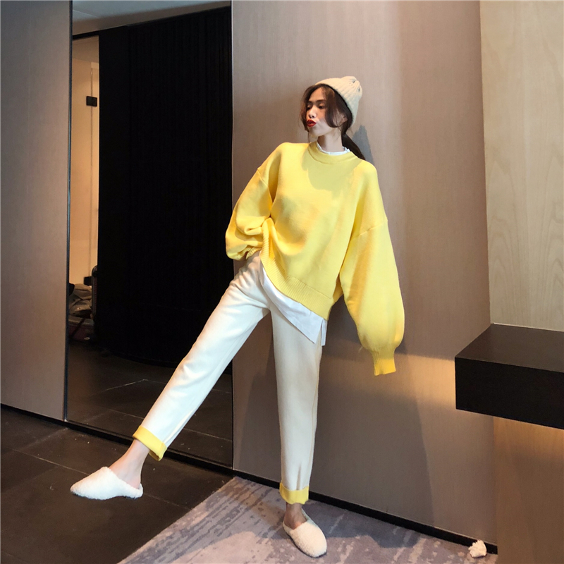 燈籠袖假兩件拼接毛衣女秋冬2018新款潮+撞色復合寬松蘿卜褲套裝