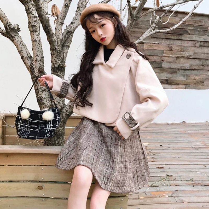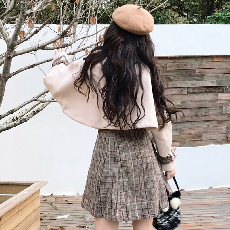 / 洋氣兩件套裝女秋冬新款毛呢斗篷外套修身內搭吊帶格子a字連衣裙