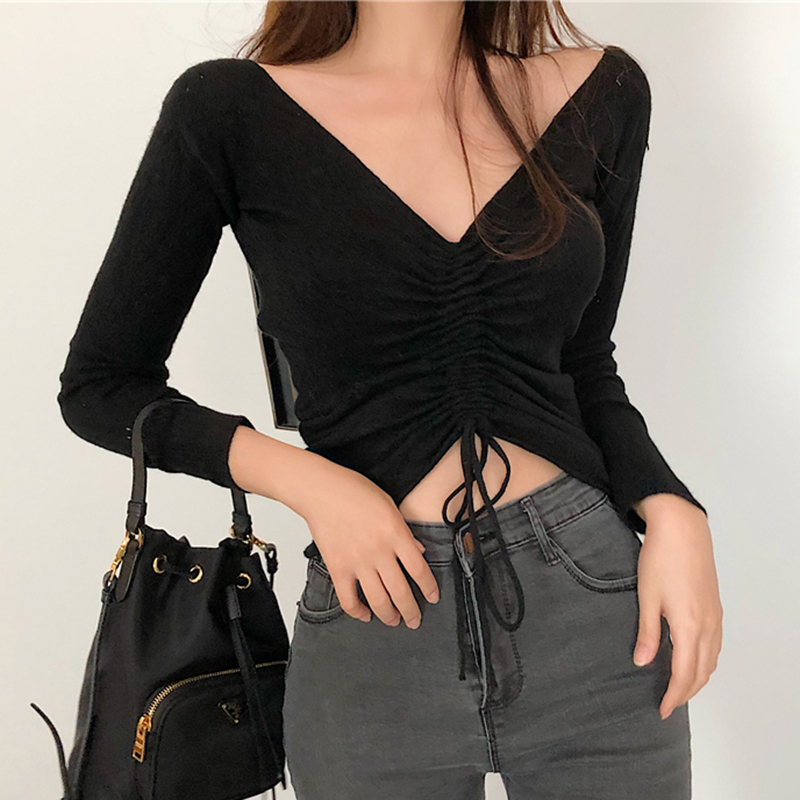 / 港味復古修身抽繩系帶氣質上衣女裝秋季新韓版長袖露臍顯瘦針織衫