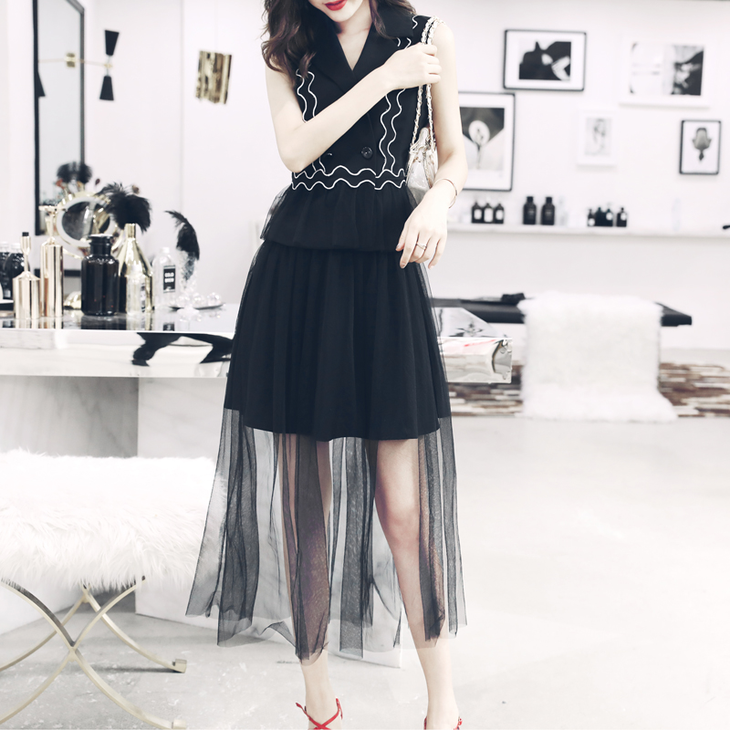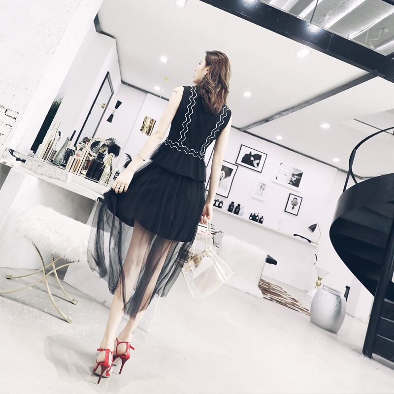 S秀時尚氣質顯瘦兩件套女裝2018夏季新款拼色上衣網紗半身裙套裝