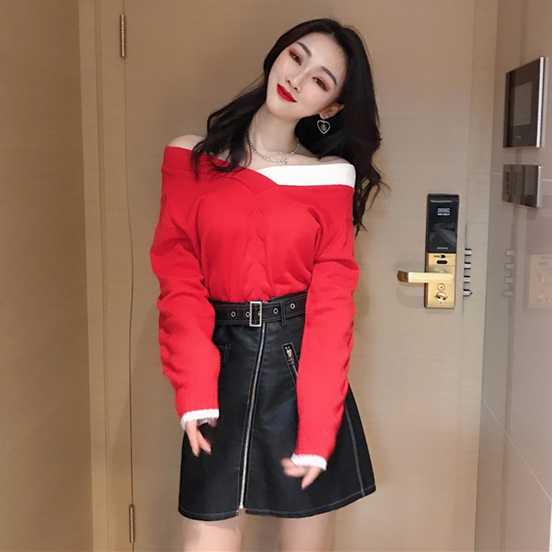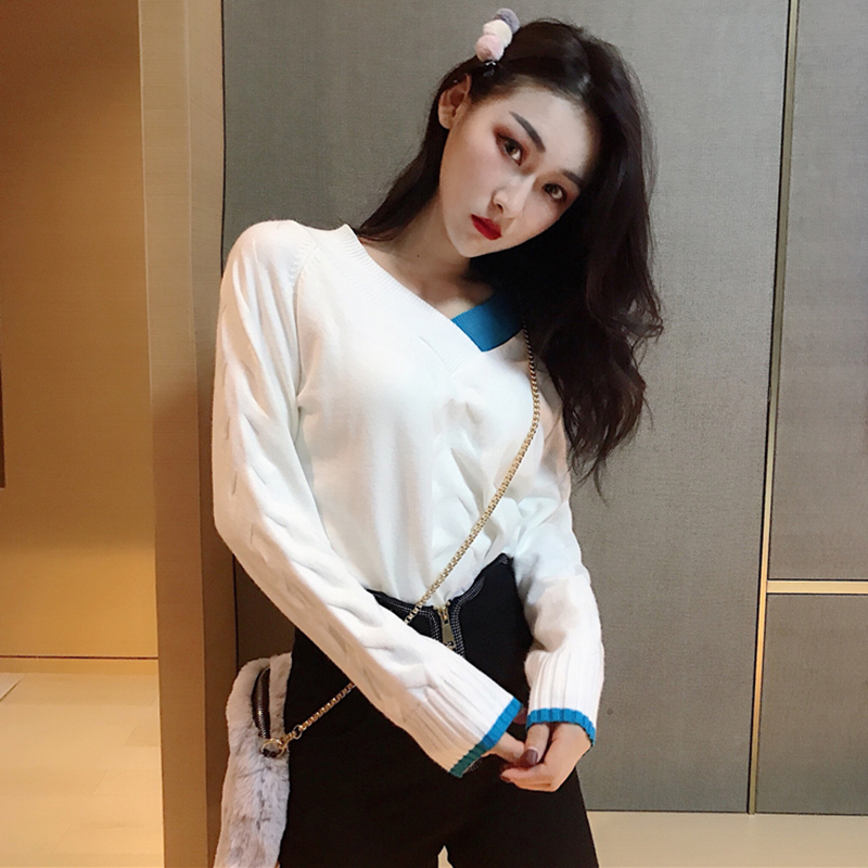 / 氣質chic拼色針織衫女秋冬裝2018新款韓版時尚寬松V領毛衣外套潮
