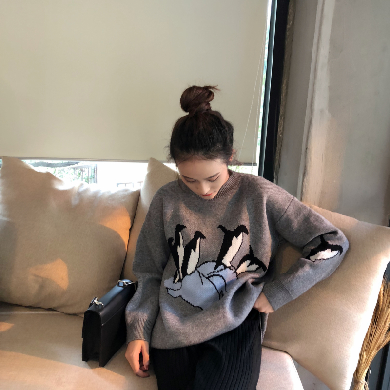 2018新款秋冬女裝韓版寬松企鵝提花套頭網紅針織衫毛衣上衣外套女