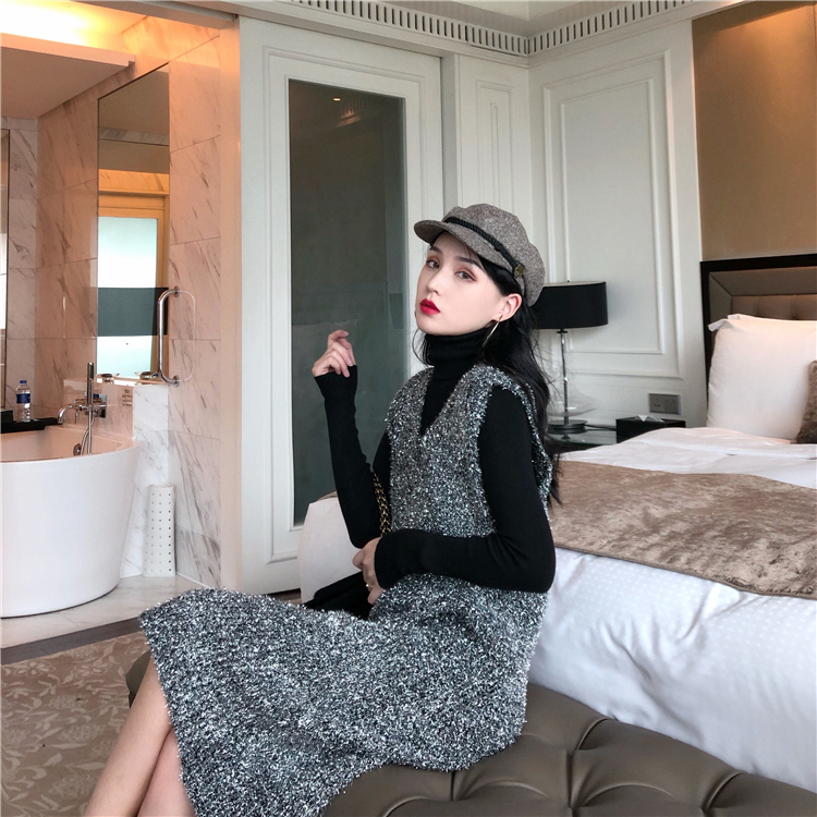 / 港味新款女裝時尚寬松亮閃針織長裙加厚高領毛衣時髦套裝兩件套潮