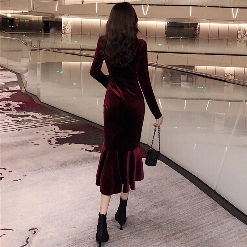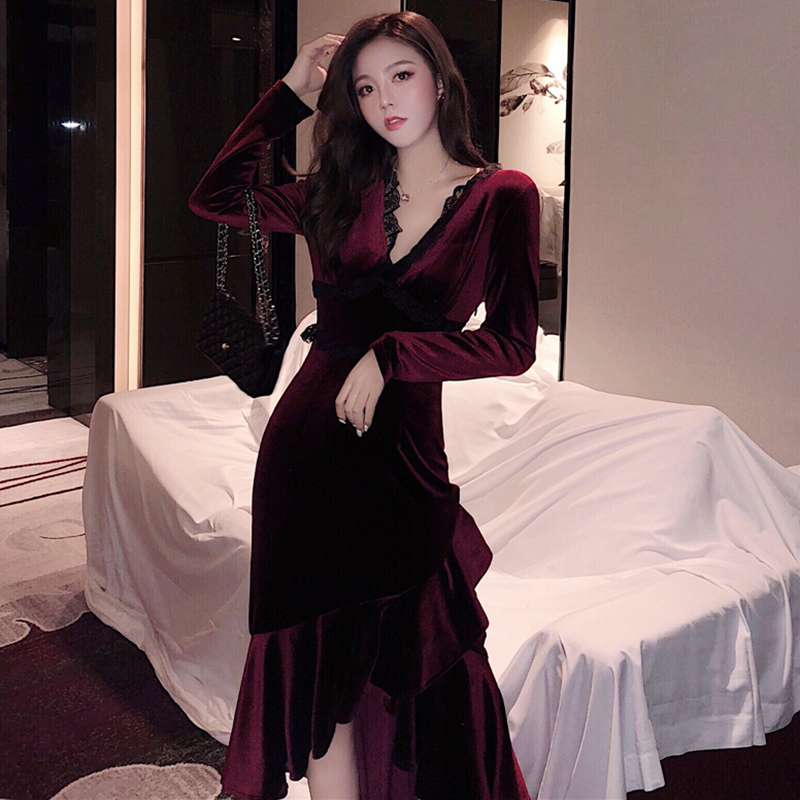 / 氣質蕾絲花邊V領egg黑色連衣裙子女秋冬裝新款復古絲絨法式桔梗裙