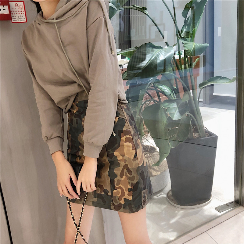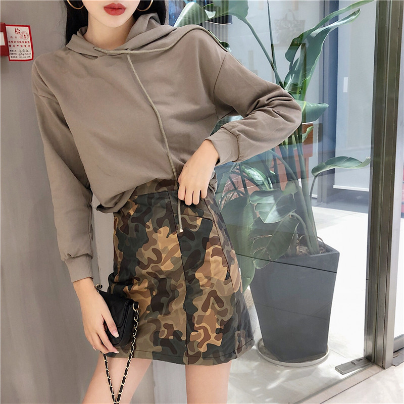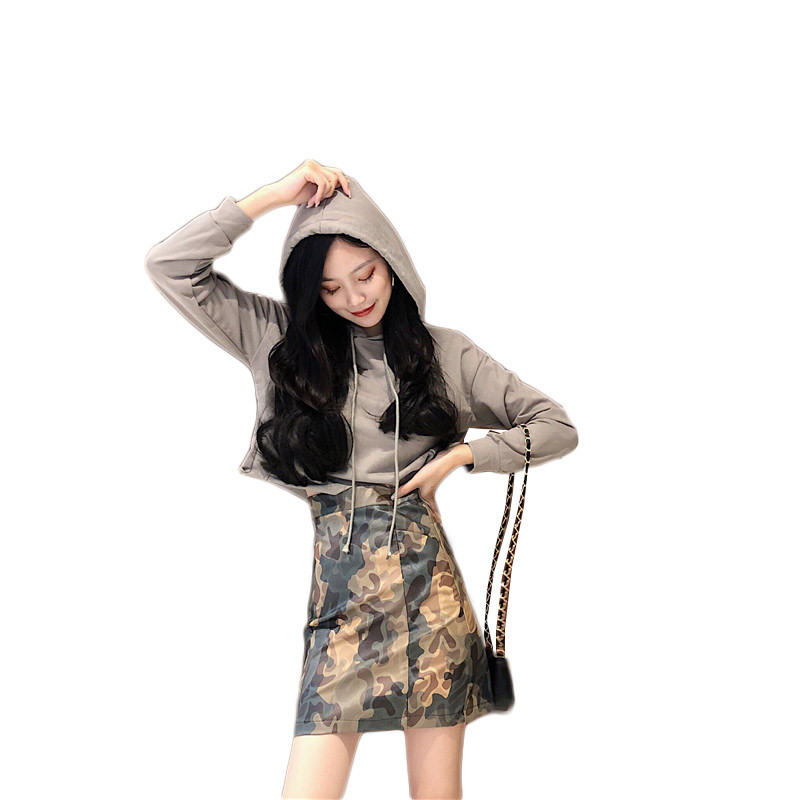/ 韓風chic長袖抽繩連帽短款衛衣+高腰迷彩半身裙套裝女夏2018新款