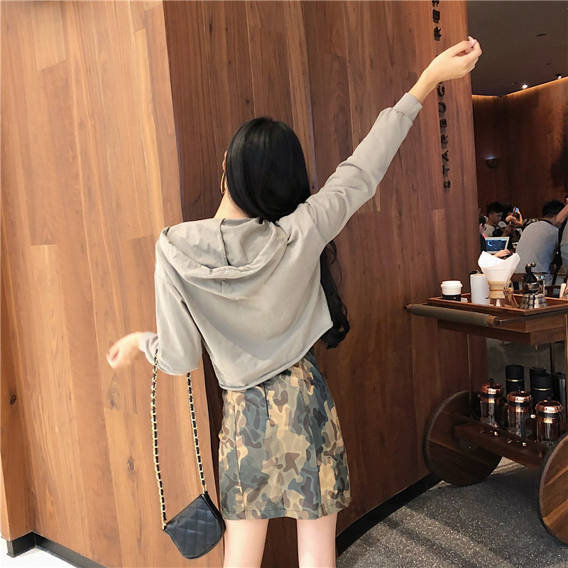 韓風chic長袖抽繩連帽短款衛衣+高腰迷彩半身裙套裝女夏2018新款