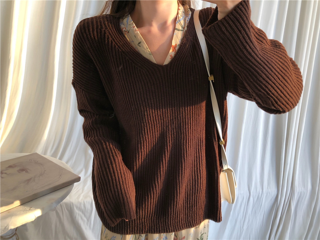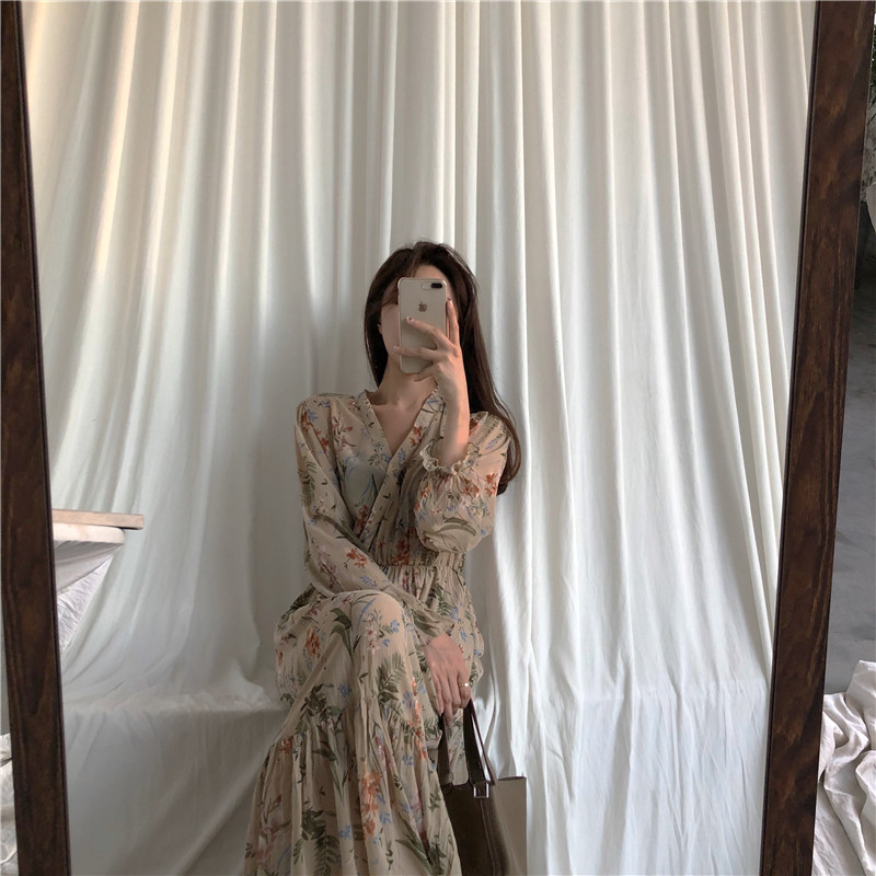 新款港風復古chic時尚套裝V領針織暖軟糯毛衣復古碎花收腰連衣裙