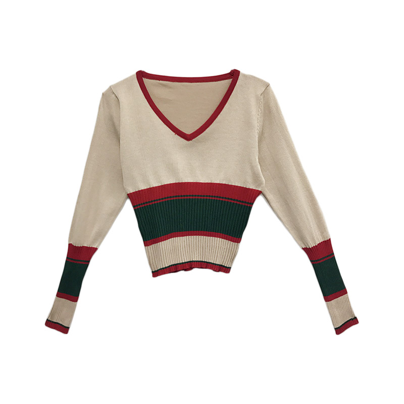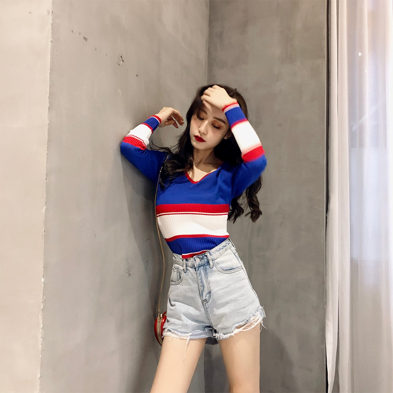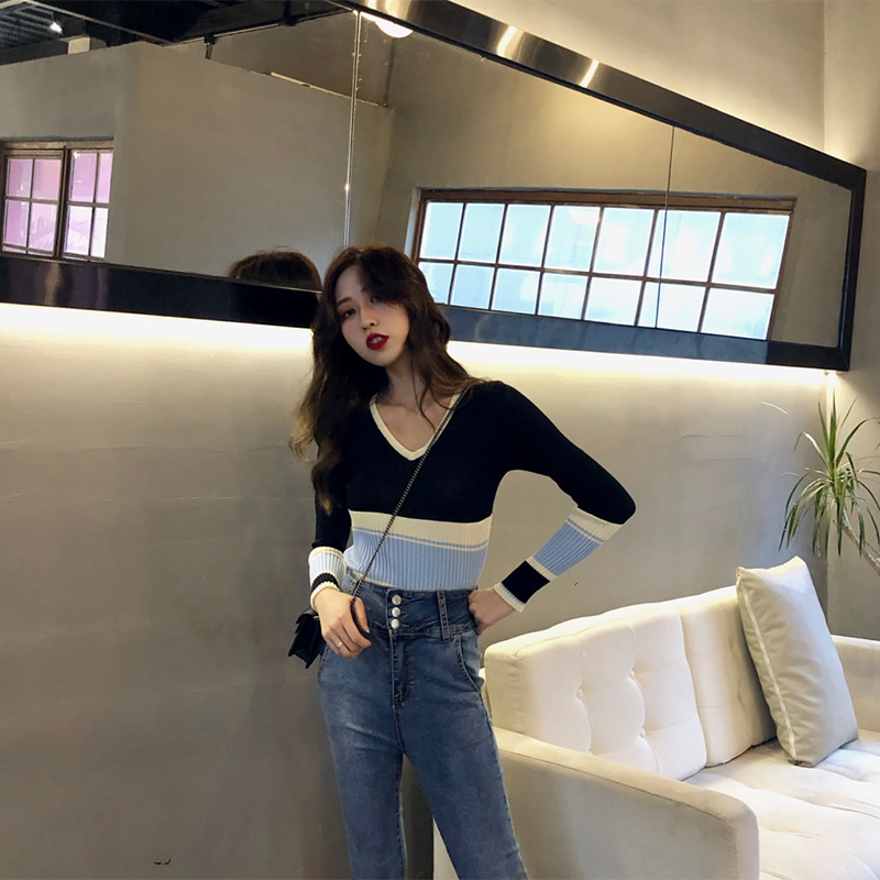 復古韓國chic風修身顯瘦條紋撞色V領長袖打底衫韓版學生針織衫女