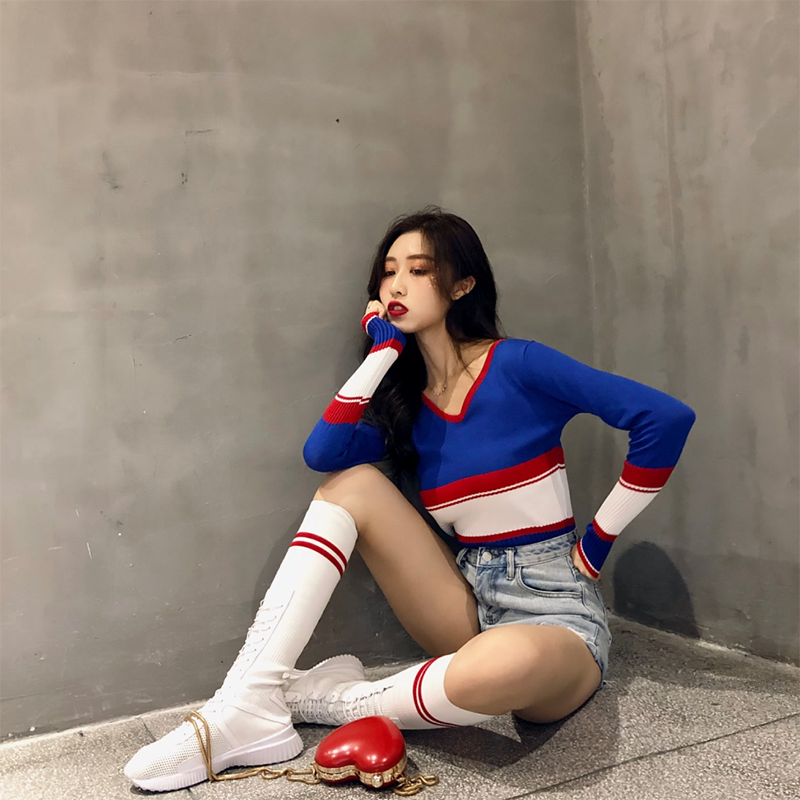 / 復古韓國chic風修身顯瘦條紋撞色V領長袖打底衫韓版學生針織衫女