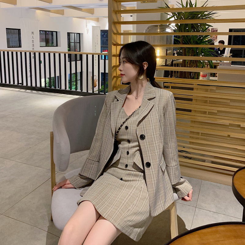 / 名媛氣質潮流時尚套裝韓版格子西服外套百搭v領吊帶連衣裙兩件套