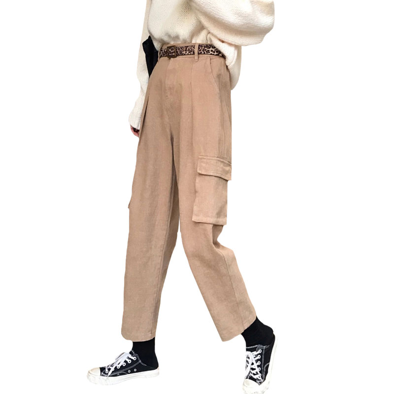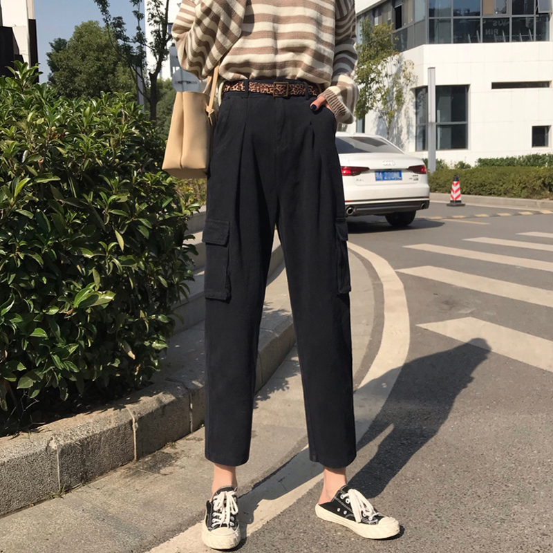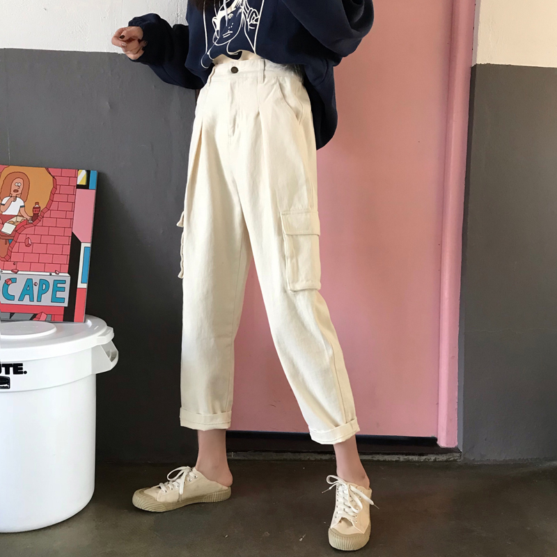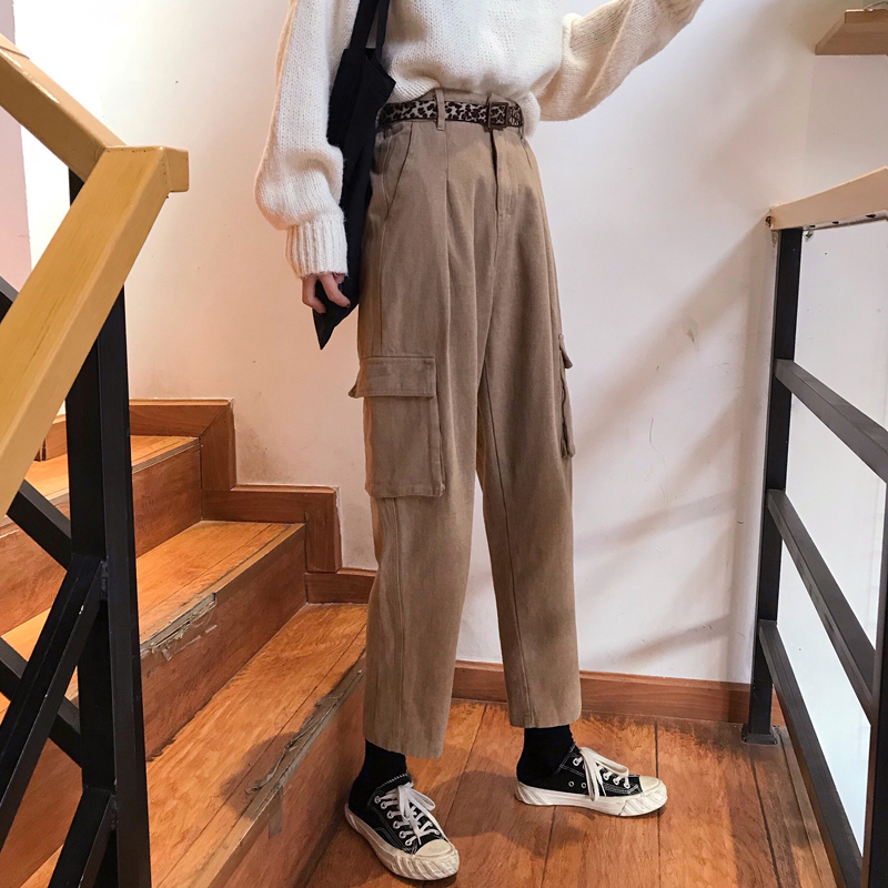 / 秋冬韓版復古寬松工裝雙口袋牛仔褲高腰顯瘦直筒褲闊腿褲九分褲女