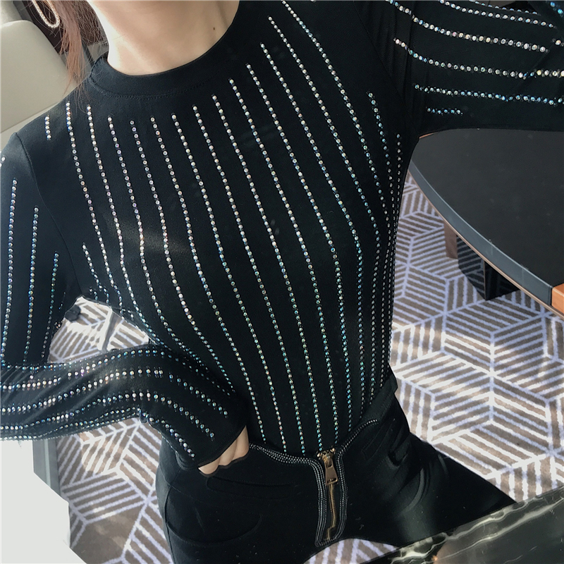 / 秋冬女裝2018新款燙鉆閃閃黑色T恤港味長袖上衣修身顯瘦打底衫潮