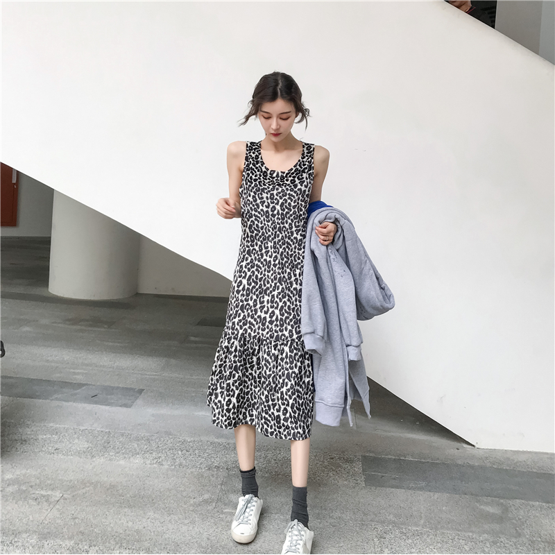 / 港味復古寬松中長款加絨連帽長袖衛衣+韓版豹紋百搭裙子