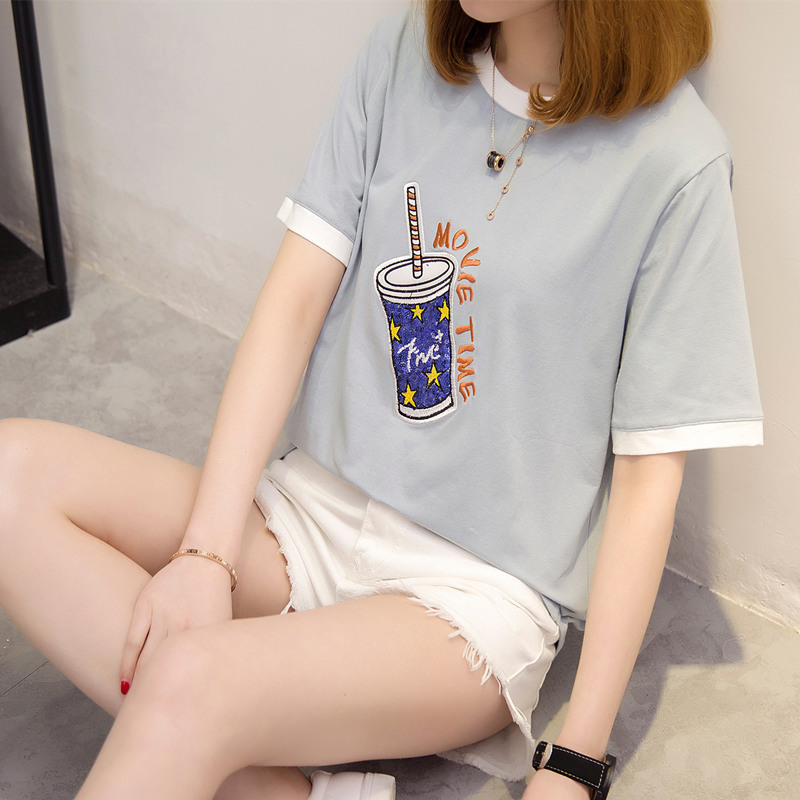 / 短袖上衣女夏新款刺繡寬松t恤女拼接打底韓版休閑體恤衫百搭