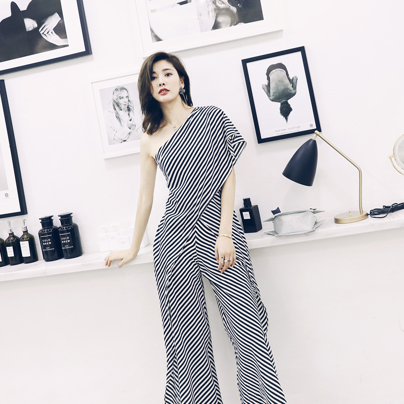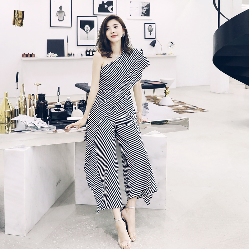/ 網紅款名媛氣質夏季2018新款女裝時髦漏肩條紋連體褲時尚闊腿褲