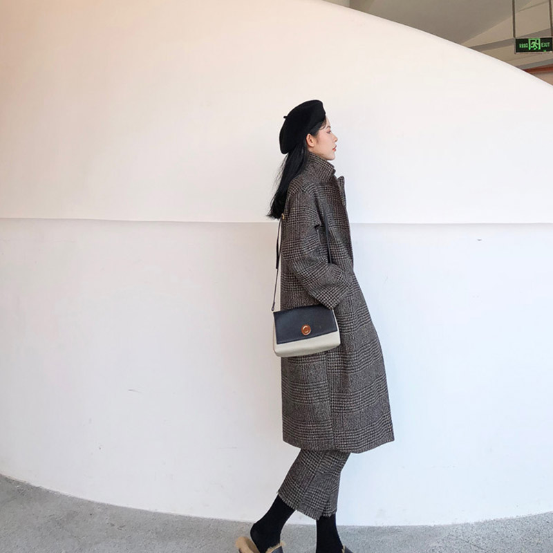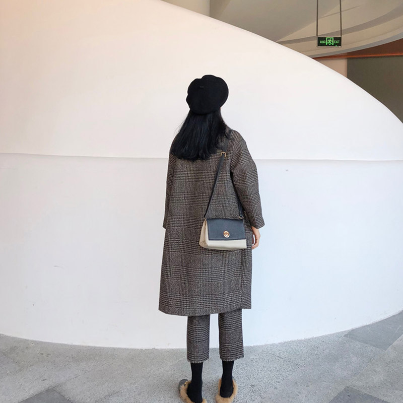 復古格子外套女秋裝2018新款ulzzang雙排扣寬松長款過膝呢子大衣
