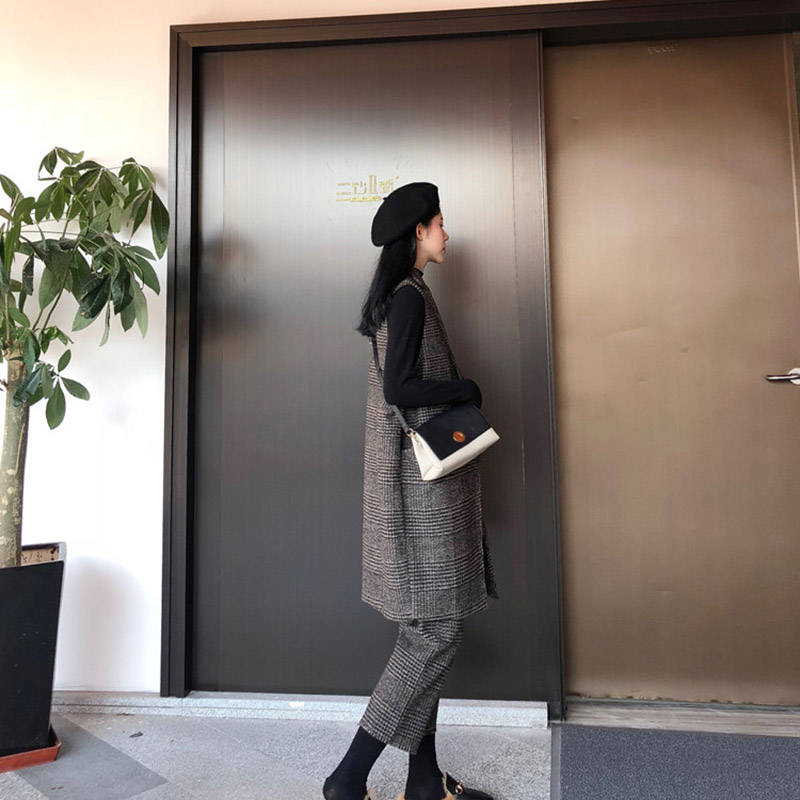 / 韓版時尚秋裝女2018新款套裝呢料長款外套+馬甲+毛邊九分褲三件套
