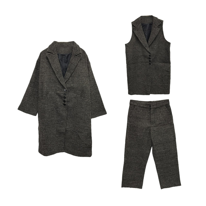 韓版時尚秋裝女2018新款套裝呢料長款外套+馬甲+毛邊九分褲三件套