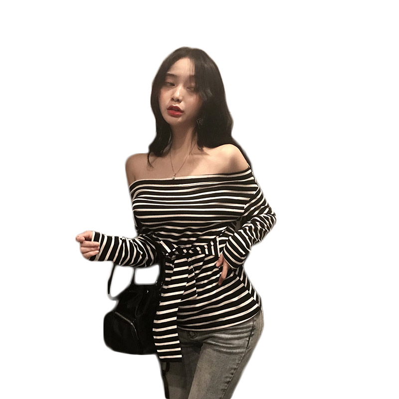 / 韓版初秋上衣女新款百搭一字肩修身顯瘦腰間系帶長袖T恤打底衫潮