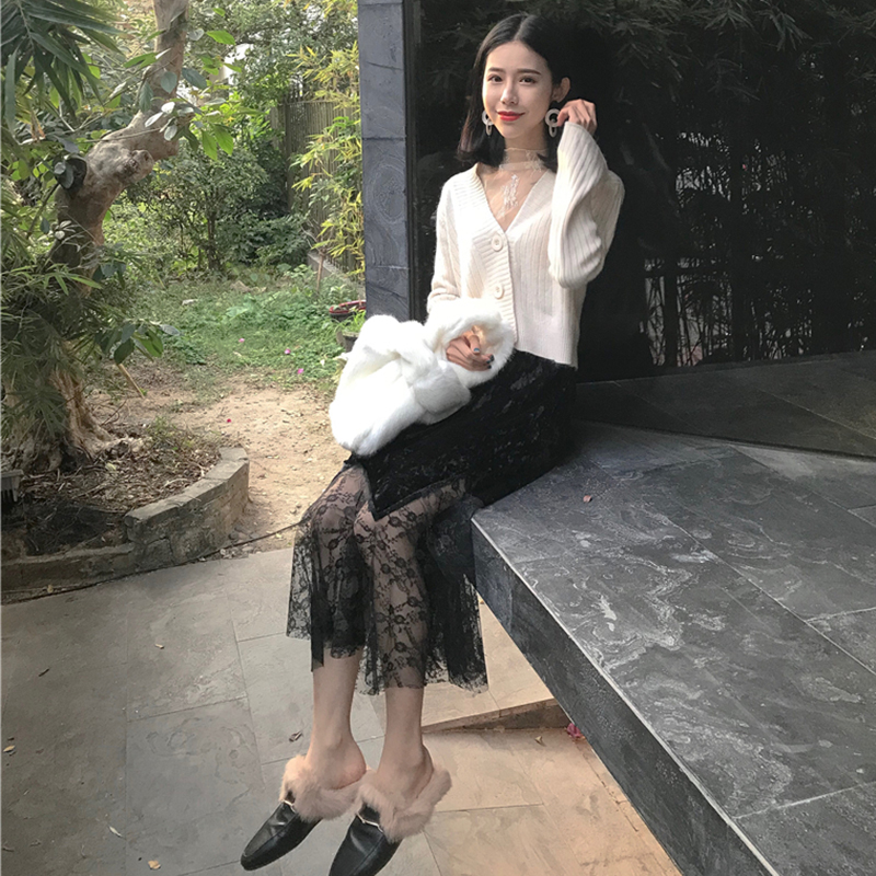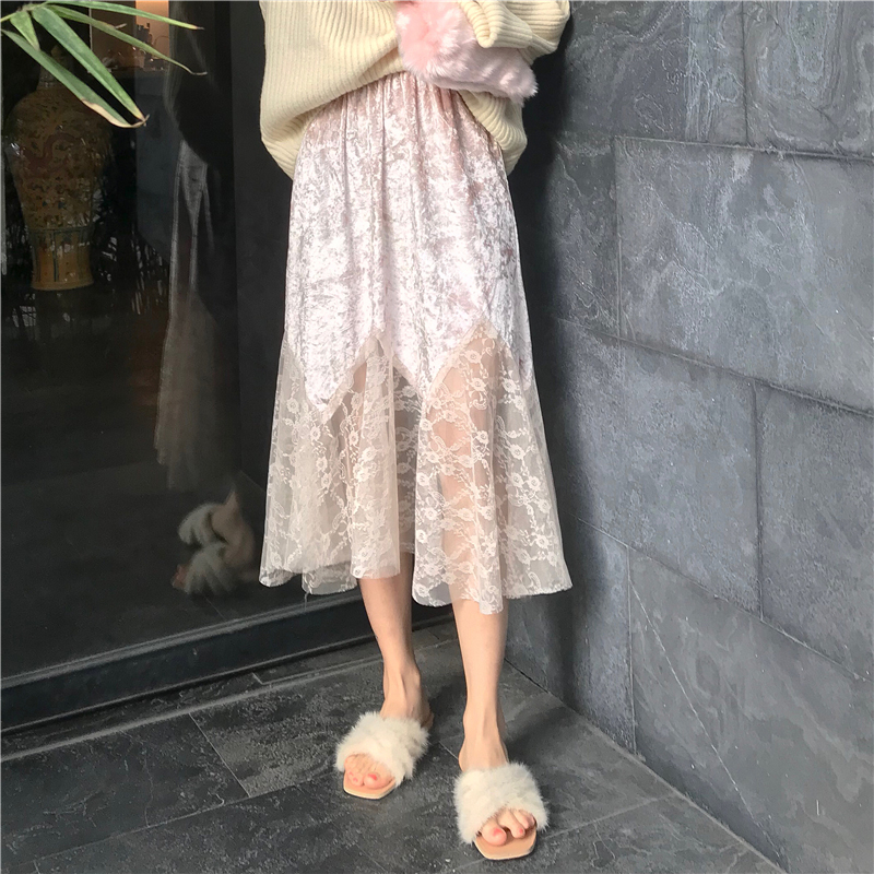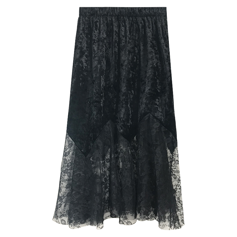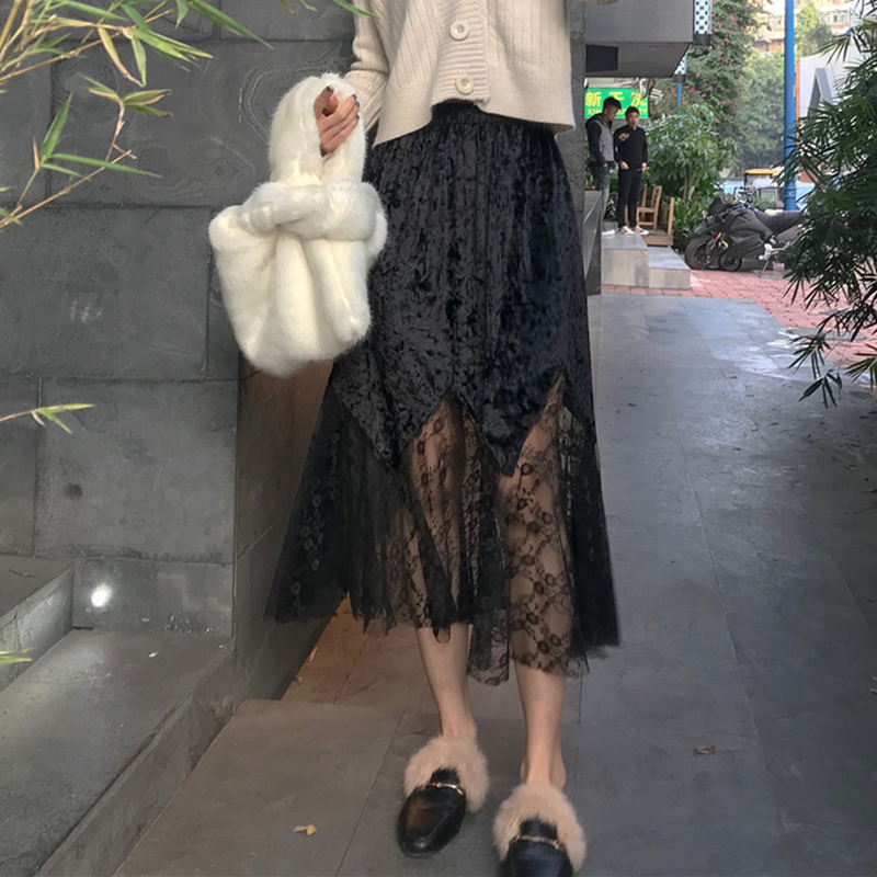 / 秋裝女新款復古時尚絲絨拼接透視雪紡半身裙顯瘦高腰a字中長裙子