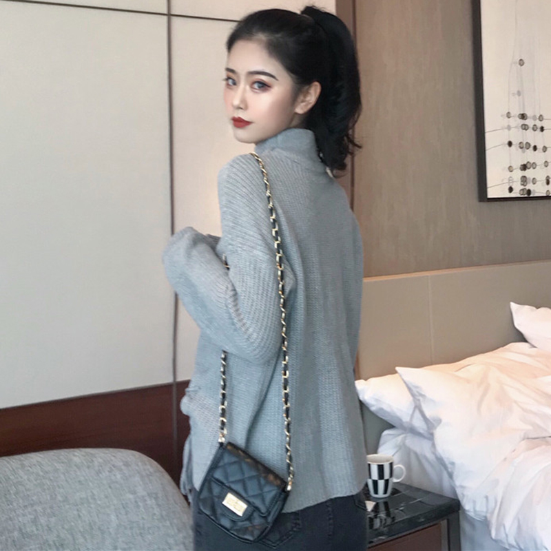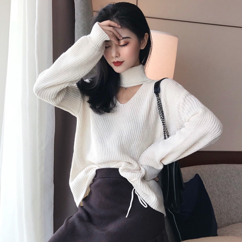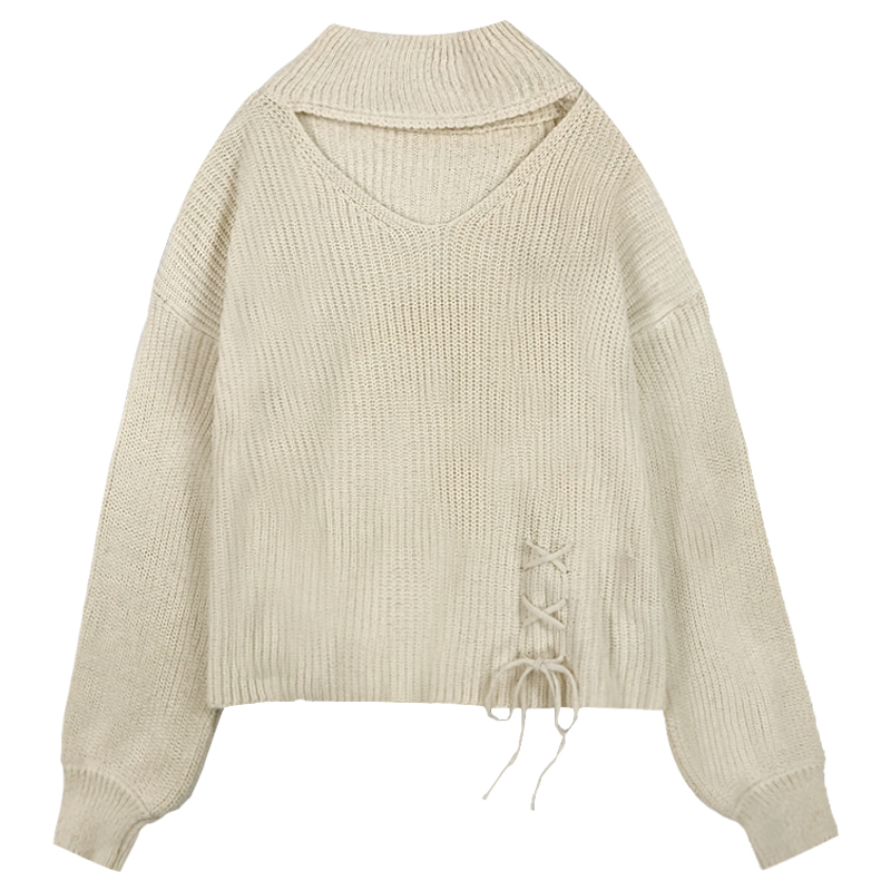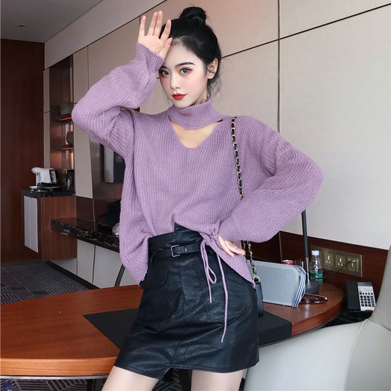 鏤空高領慵懶套頭毛衣女秋冬裝新款系帶純色寬松針織外套長袖上衣