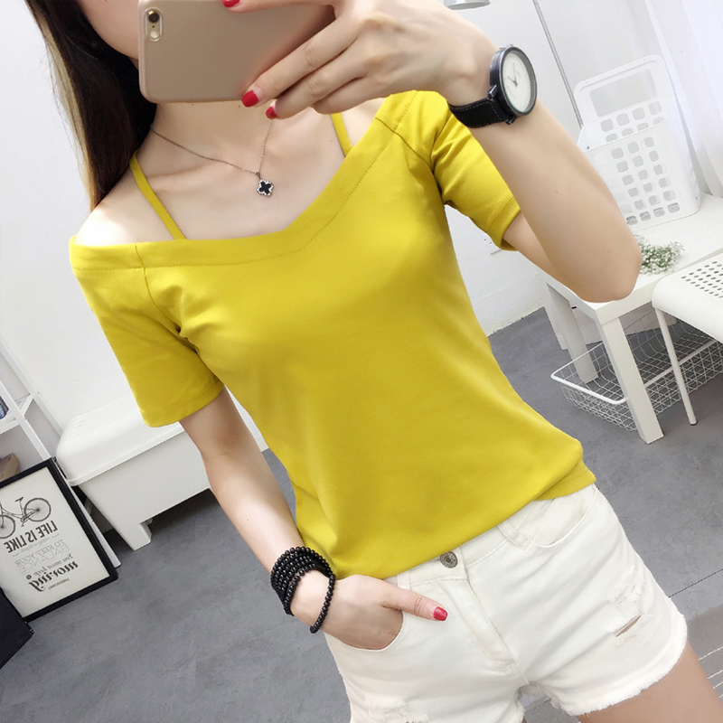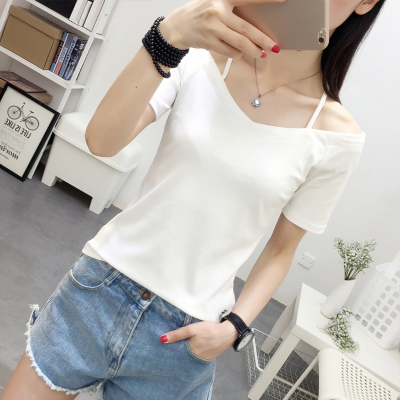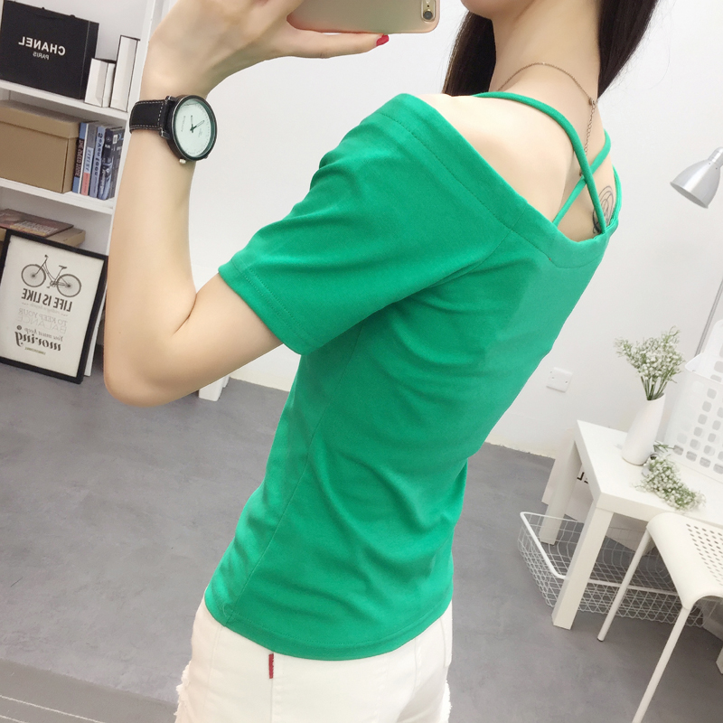 / 夏裝韓版漏肩純色v領t恤女短袖打底衫心機半袖體恤短款上衣潮