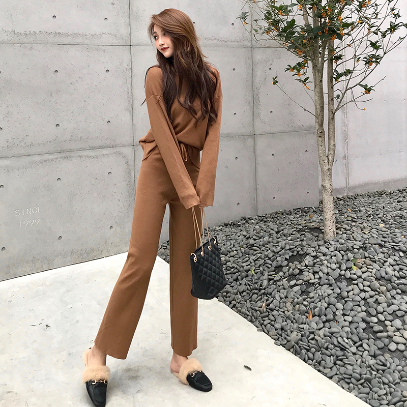 新款韓版寬松顯瘦長袖套頭上衣松緊腰直筒九分褲時尚套裝兩件套女