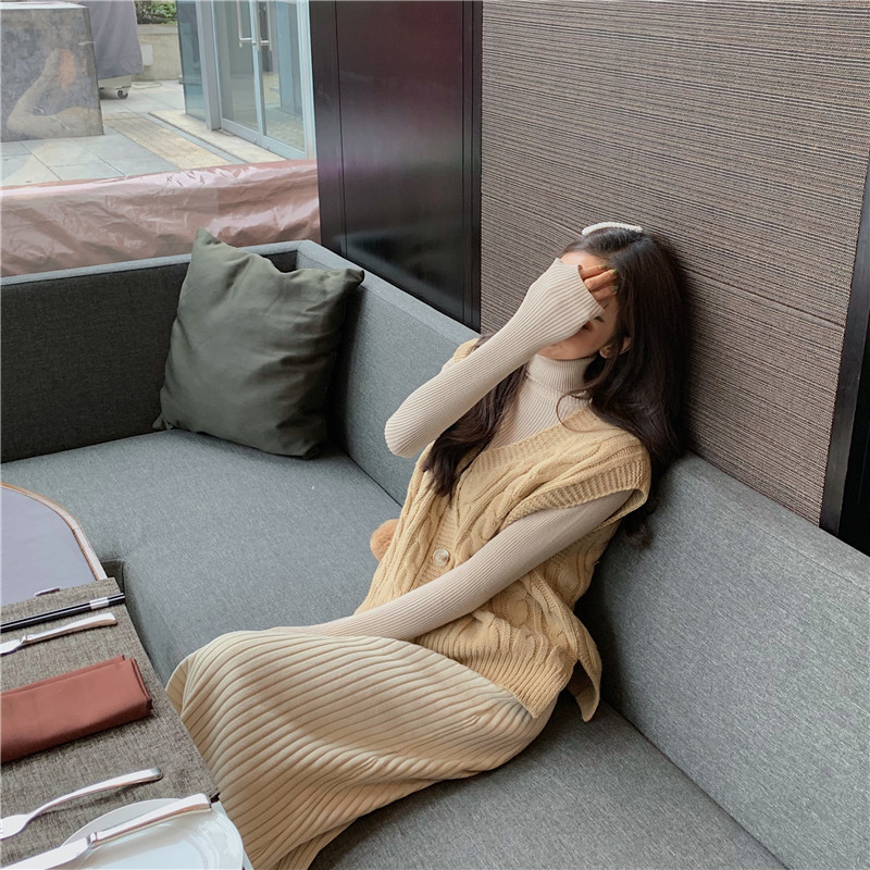 / 復古女神套裝秋冬新款百搭毛衣背心+針織高領打底+高腰一步針織裙