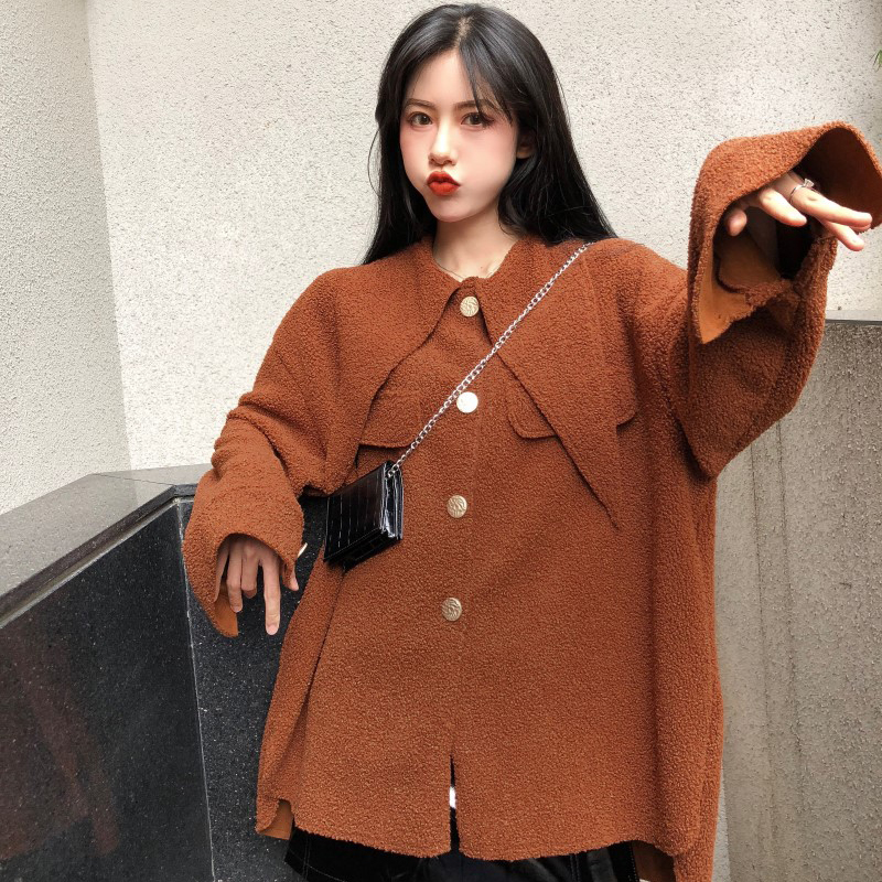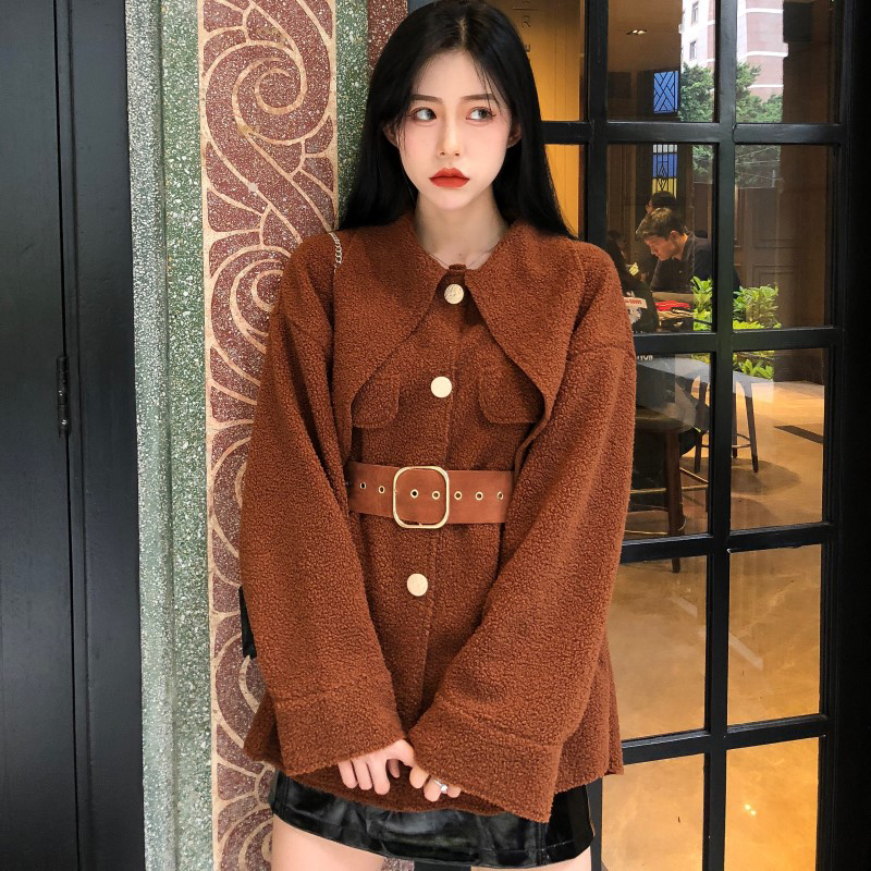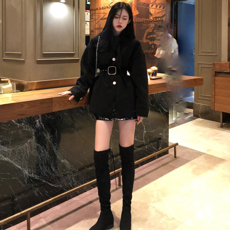復古黑色羊羔毛外套秋冬女裝2018新款港風寬松開衫收腰顯瘦上衣潮