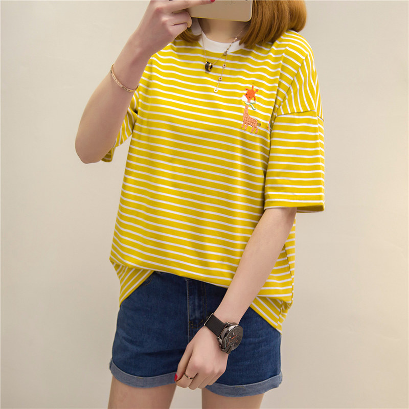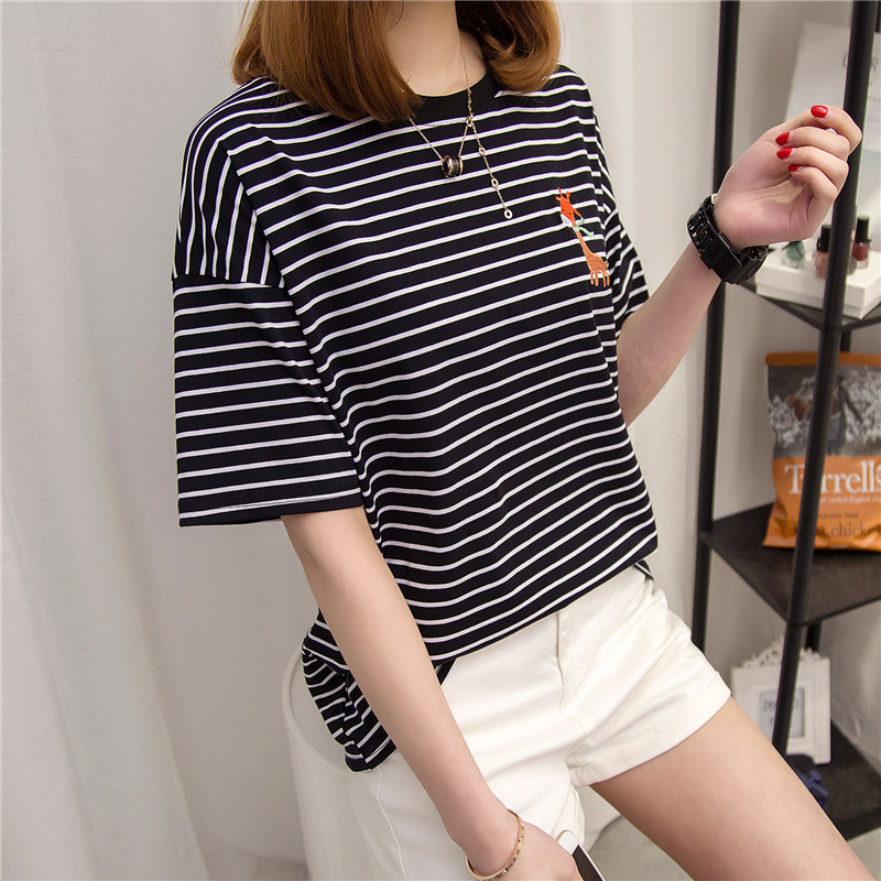 打底衫春季新款女條紋短袖t恤女寬松上衣韓版學生百搭體恤潮