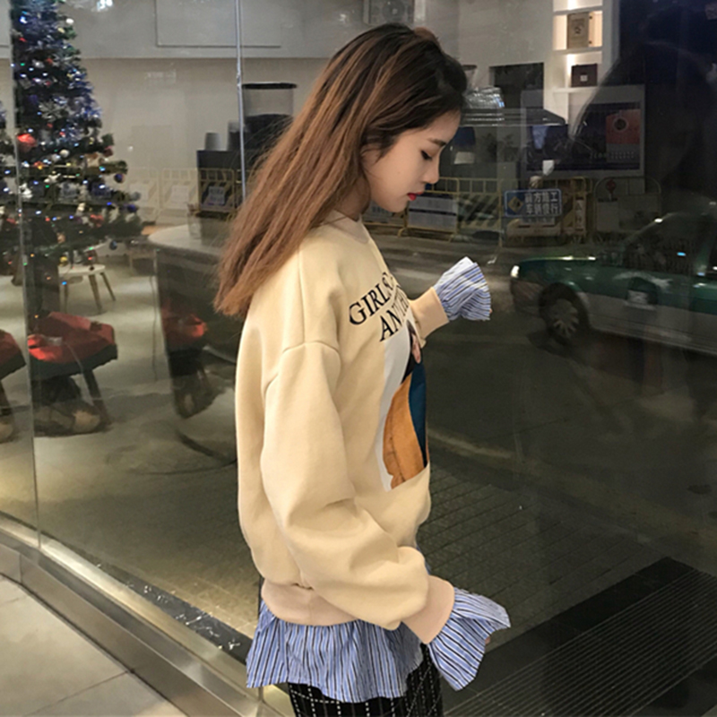 秋冬女裝2018新款寬松字母人物印花衛衣假兩件拼接條紋荷葉袖外套