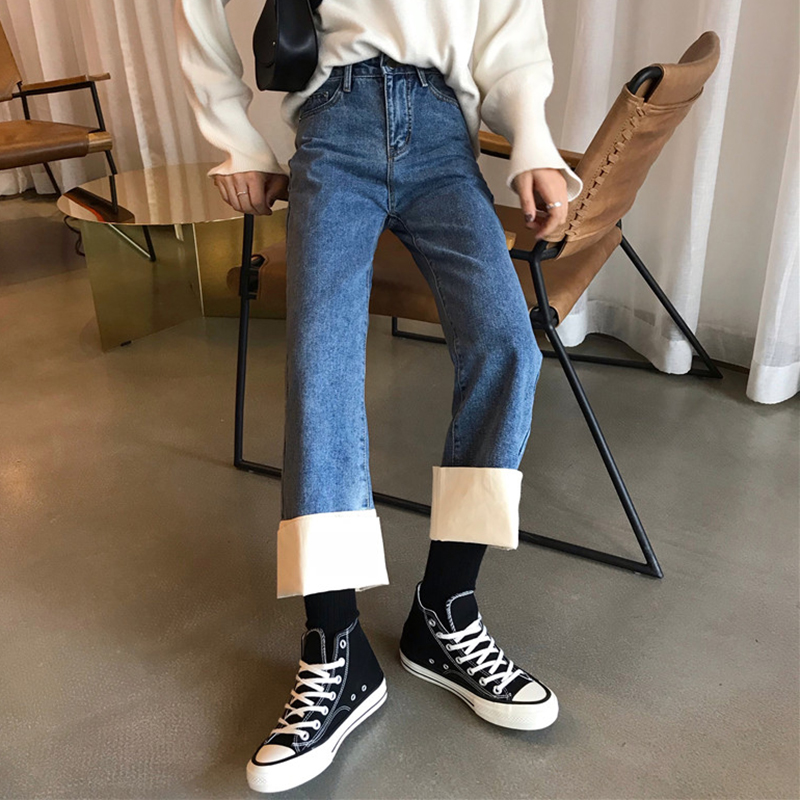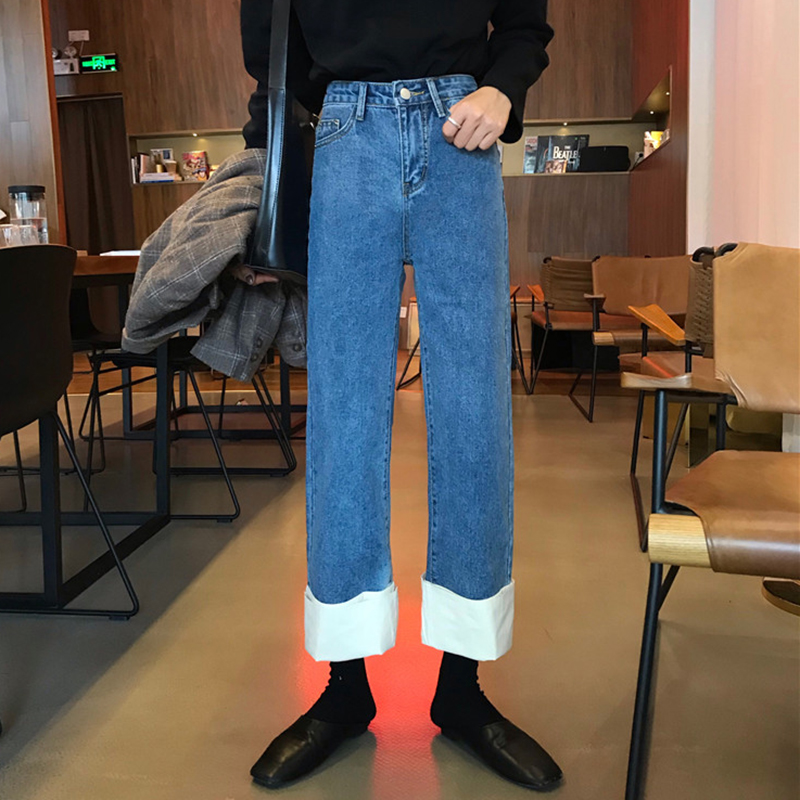 / 高腰顯瘦撞色卷邊牛仔褲女秋冬裝新款復古風直筒寬松闊腿九分褲子