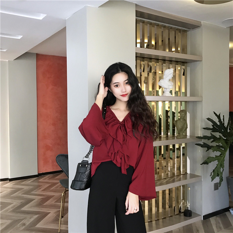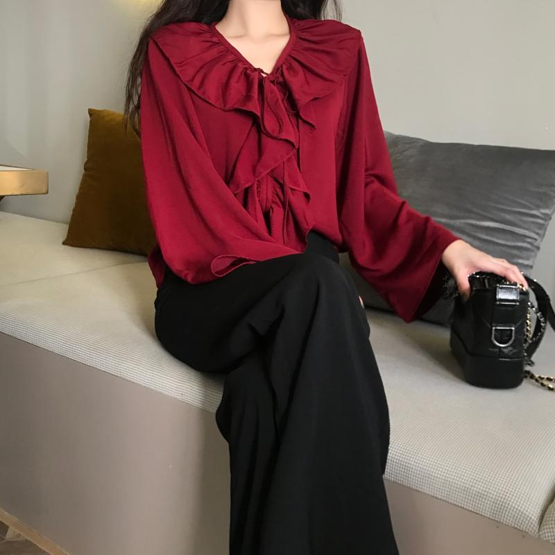 / chic早秋上衣V領荷葉邊酒紅色長袖襯衫+高腰垂感拖地休閑直筒長褲