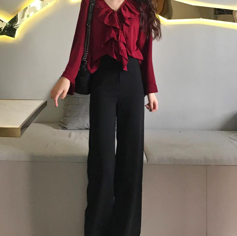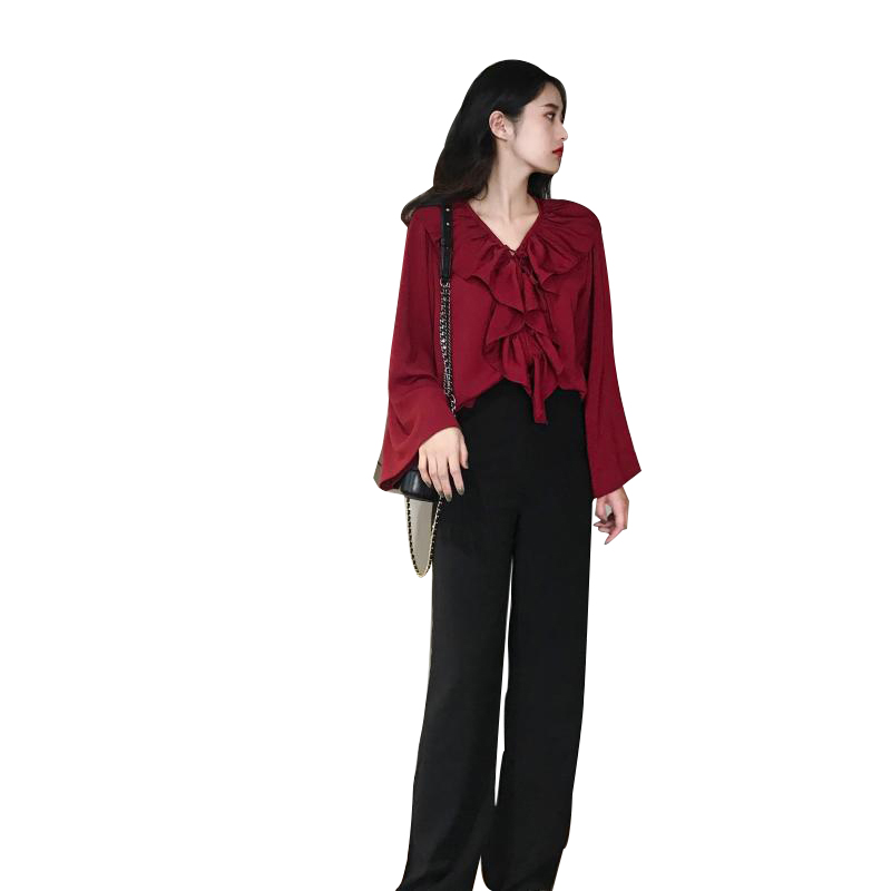 chic早秋上衣V領荷葉邊酒紅色長袖襯衫+高腰垂感拖地休閑直筒長褲