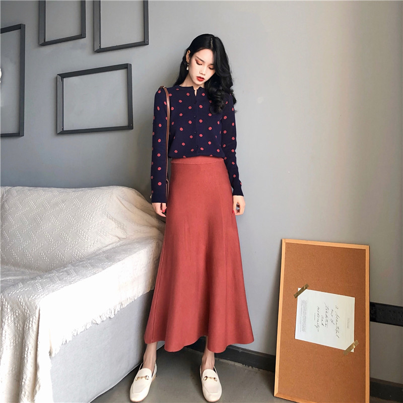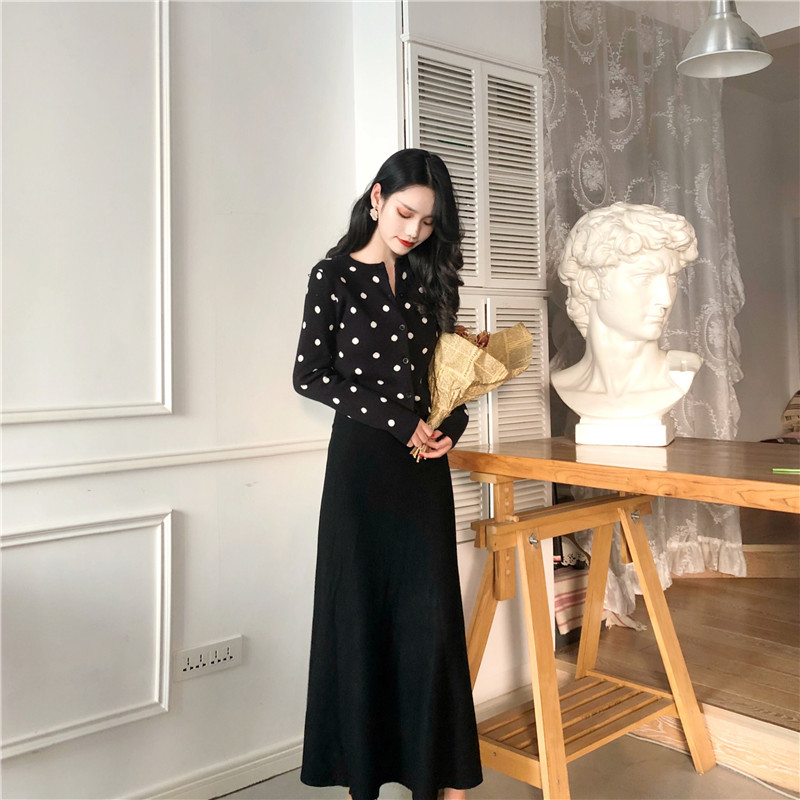 韓國ulzzang單排扣百搭波點針織開衫外套女+高腰中長半裙復古套裝